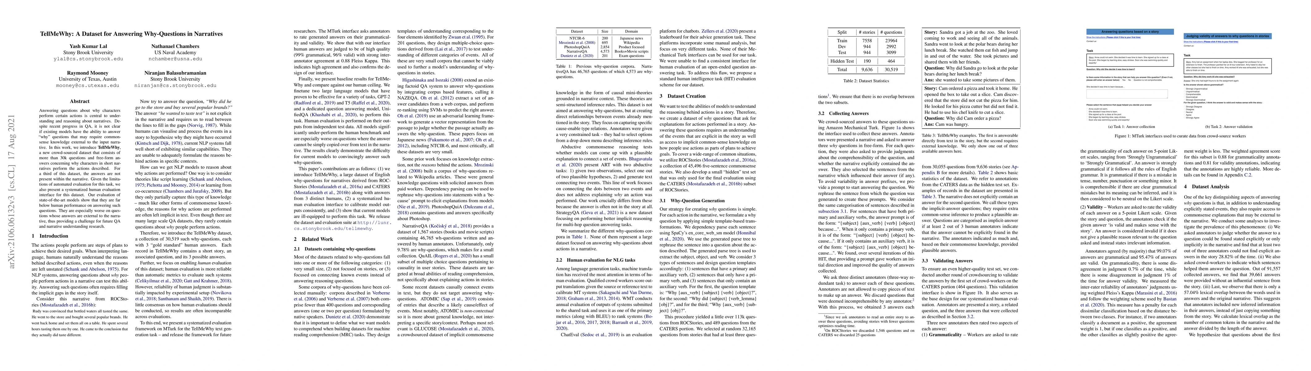 TellMeWhy is a new dataset for answering "why" questions in narratives, featuring over 30k questions and answers that often require external commonsense knowledge. The dataset highlights the limitations of current models in answering such questions, especially when the answers are not within the narrative, posing a challenge for future research.