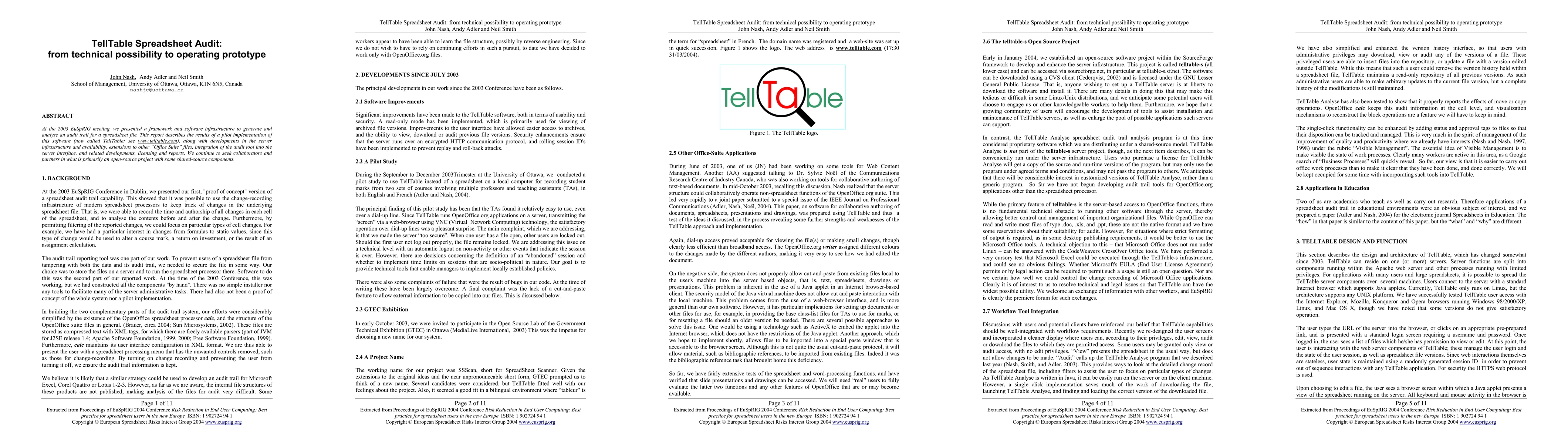 At the 2003 EuSpRIG meeting, we presented a framework and software infrastructure to generate and analyse an audit trail for a spreadsheet file. This report describes the results of a pilot implementation of this software (now called TellTable; see www.telltable.com), along with developments in the server infrastructure and availability, extensions to other "Office Suite" files, integration of the audit tool into the server interface, and related developments, licensing and reports. We continue to seek collaborators and partners in what is primarily an open-source project with some shared-source components.