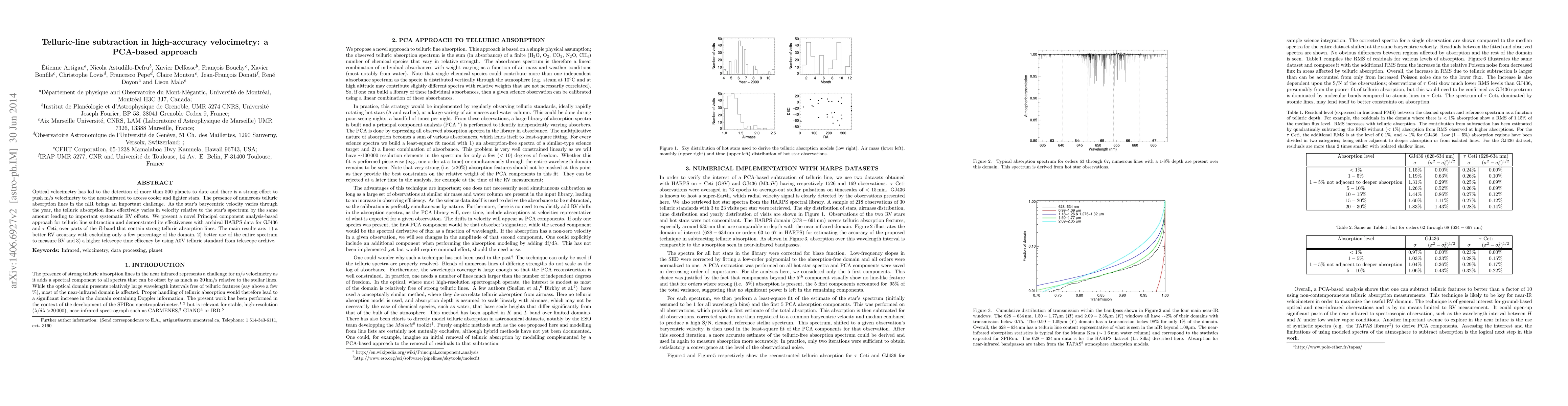 This paper introduces a PCA-based method for telluric line subtraction in high-accuracy optical velocimetry, demonstrating improved radial velocity accuracy and efficiency using archival HARPS data from GJ436 and τ Ceti. The approach enhances the use of the entire spectrum for radial velocity measurements and increases telescope time efficiency.