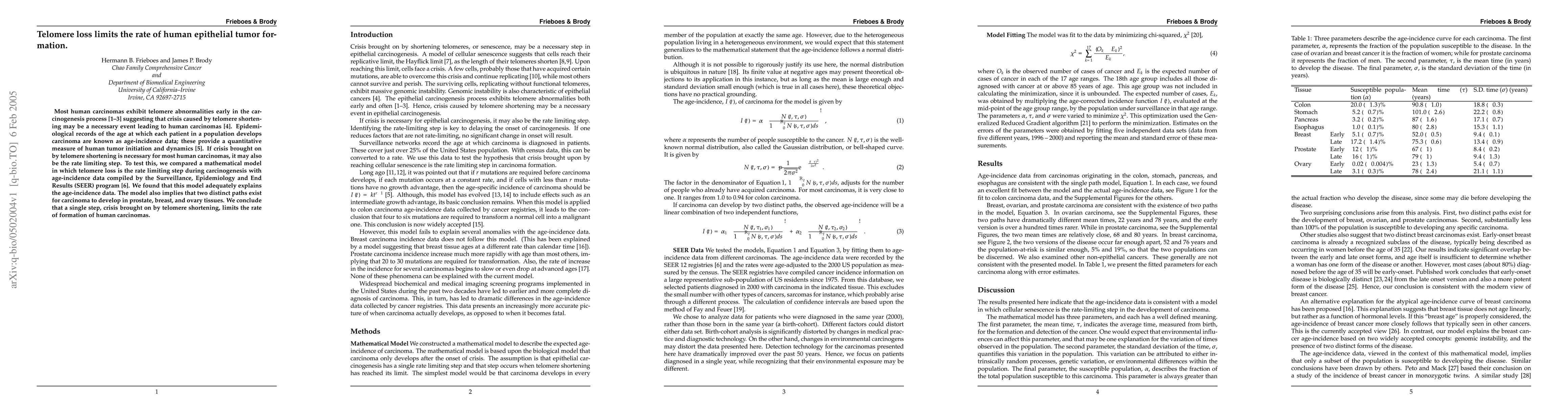 Most human carcinomas exhibit telomere abnormalities early in the carcinogenesis process suggesting that crisis caused by telomere shortening may be a necessary event leading to human carcinomas. Epidemiological records of the age at which each patient in a population develops carcinoma are known as age-incidence data; these provide a quantitative measure of human tumor initiation and dynamics. If crisis brought on by telomere shortening is necessary for most human carcinomas, it may also be the rate limiting step. To test this, we compared a mathematical model in which telomere loss is the rate limiting step during carcinogenesis with age-incidence data compiled by the Surveillance, Epidemiology and End Results (SEER) program. We found that this model adequately explains the age-incidence data. The model also implies that two distinct paths exist for carcinoma to develop in prostate, breast, and ovary tissues. We conclude that a single step, crisis brought on by telomere shortening, limits the rate of formation of human carcinomas.