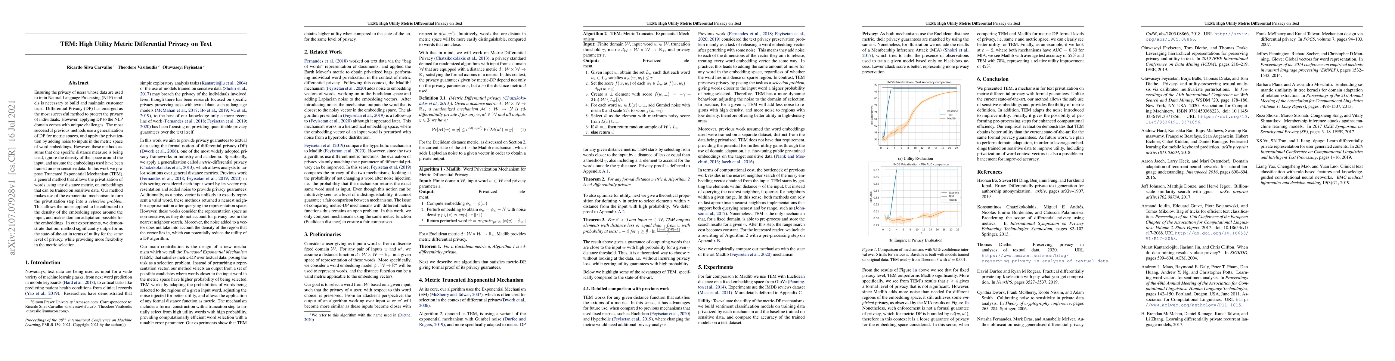 This paper proposes Truncated Exponential Mechanism (TEM), a general method for privatizing text data in Natural Language Processing models while offering flexibility in distance metric selection and domain adaptation capabilities.