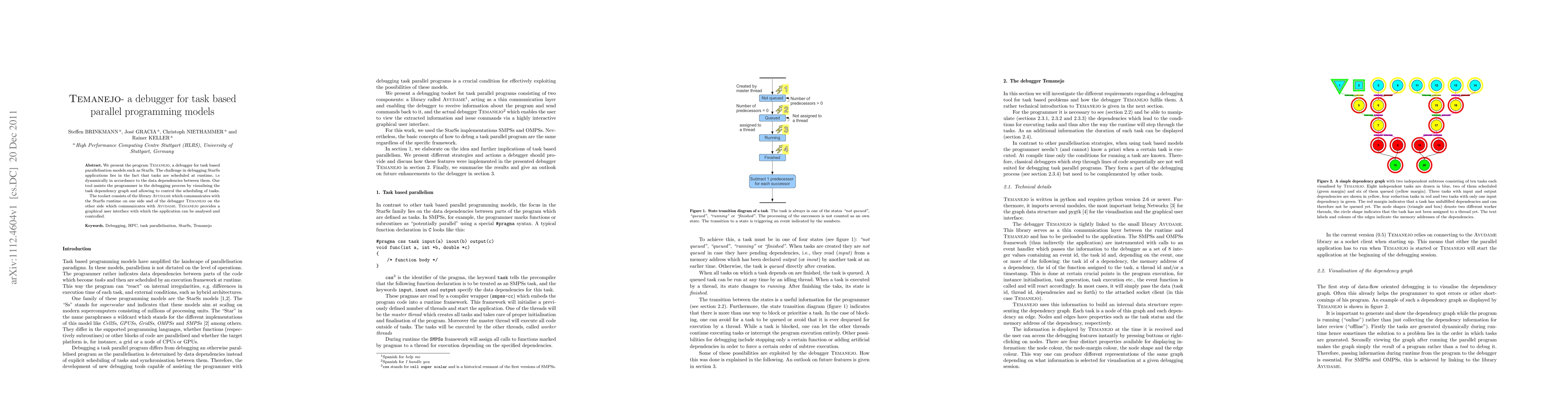 Temanejo is a debugger designed to assist in debugging task-based parallel programming models like StarSs by visualizing task dependency graphs and enabling runtime task scheduling control. It includes the Ayudame library for communication with the StarSs runtime.