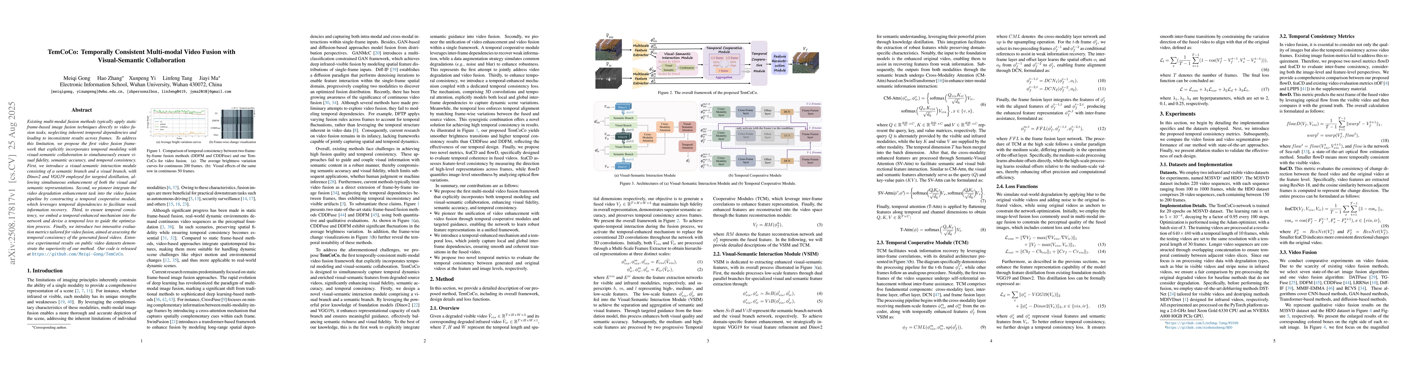 Existing multi-modal fusion methods typically apply static frame-based image fusion techniques directly to video fusion tasks, neglecting inherent temporal dependencies and leading to inconsistent results across frames. To address this limitation, we propose the first video fusion framework that explicitly incorporates temporal modeling with visual-semantic collaboration to simultaneously ensure visual fidelity, semantic accuracy, and temporal consistency. First, we introduce a visual-semantic interaction module consisting of a semantic branch and a visual branch, with Dinov2 and VGG19 employed for targeted distillation, allowing simultaneous enhancement of both the visual and semantic representations. Second, we pioneer integrate the video degradation enhancement task into the video fusion pipeline by constructing a temporal cooperative module, which leverages temporal dependencies to facilitate weak information recovery. Third, to ensure temporal consistency, we embed a temporal-enhanced mechanism into the network and devise a temporal loss to guide the optimization process. Finally, we introduce two innovative evaluation metrics tailored for video fusion, aimed at assessing the temporal consistency of the generated fused videos. Extensive experimental results on public video datasets demonstrate the superiority of our method. Our code is released at https://github.com/Meiqi-Gong/TemCoCo.