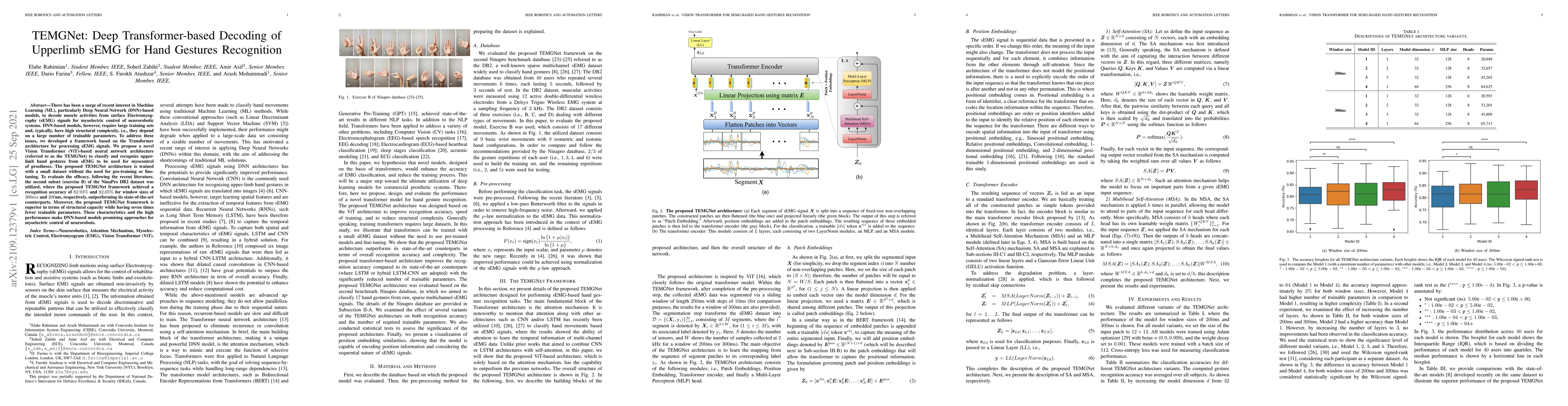 There has been a surge of recent interest in Machine Learning (ML), particularly Deep Neural Network (DNN)-based models, to decode muscle activities from surface Electromyography (sEMG) signals for myoelectric control of neurorobotic systems. DNN-based models, however, require large training sets and, typically, have high structural complexity, i.e., they depend on a large number of trainable parameters. To address these issues, we developed a framework based on the Transformer architecture for processing sEMG signals. We propose a novel Vision Transformer (ViT)-based neural network architecture (referred to as the TEMGNet) to classify and recognize upperlimb hand gestures from sEMG to be used for myocontrol of prostheses. The proposed TEMGNet architecture is trained with a small dataset without the need for pre-training or fine-tuning. To evaluate the efficacy, following the-recent literature, the second subset (exercise B) of the NinaPro DB2 dataset was utilized, where the proposed TEMGNet framework achieved a recognition accuracy of 82.93% and 82.05% for window sizes of 300ms and 200ms, respectively, outperforming its state-of-the-art counterparts. Moreover, the proposed TEMGNet framework is superior in terms of structural capacity while having seven times fewer trainable parameters. These characteristics and the high performance make DNN-based models promising approaches for myoelectric control of neurorobots.