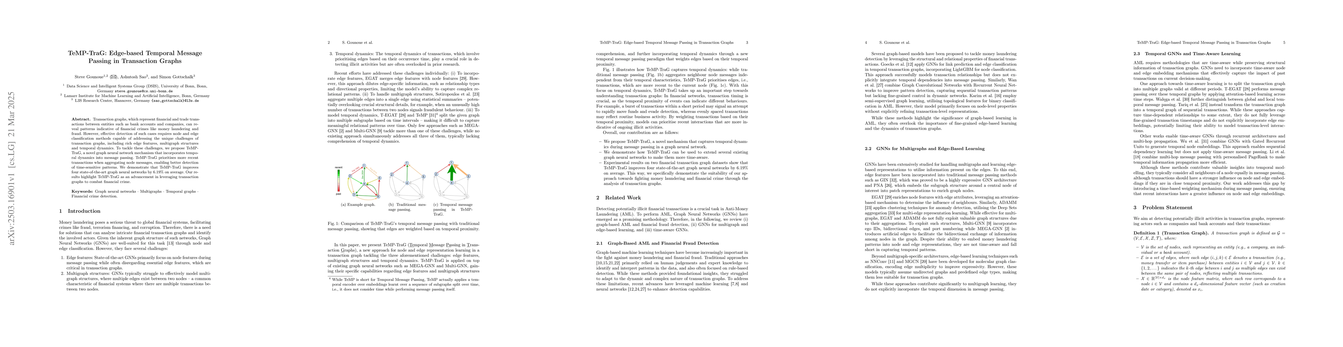 This research is significant as it addresses the unique challenges of transaction graphs, including rich edge features, multigraph structures, and temporal dynamics, which are crucial for detecting financial crimes like money laundering and fraud. By effectively handling edge features and temporal information, TeMP-TraG enhances the ability of GNNs to capture time-sensitive patterns, leading to more effective detection of suspicious activities in financial transaction graphs.