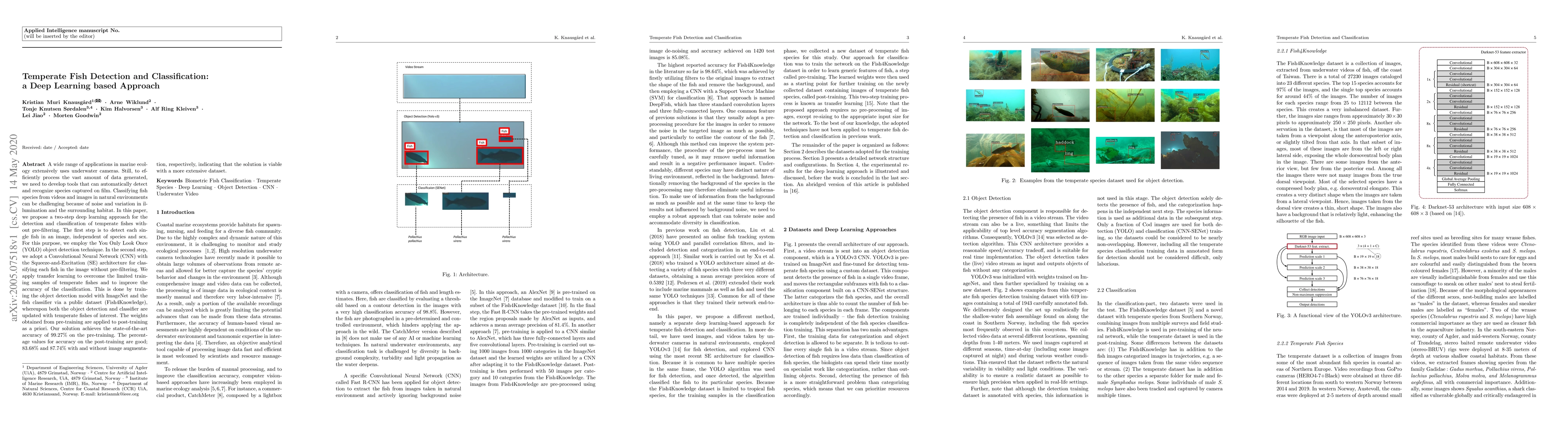 This paper presents a two-step deep learning approach using YOLO for fish detection and a CNN with SE architecture for classification, achieving 99.27% accuracy pre-training and 83.68% and 87.74% post-training accuracy with and without augmentation, respectively. The method leverages transfer learning from ImageNet and Fish4Knowledge datasets to handle limited temperate fish samples.