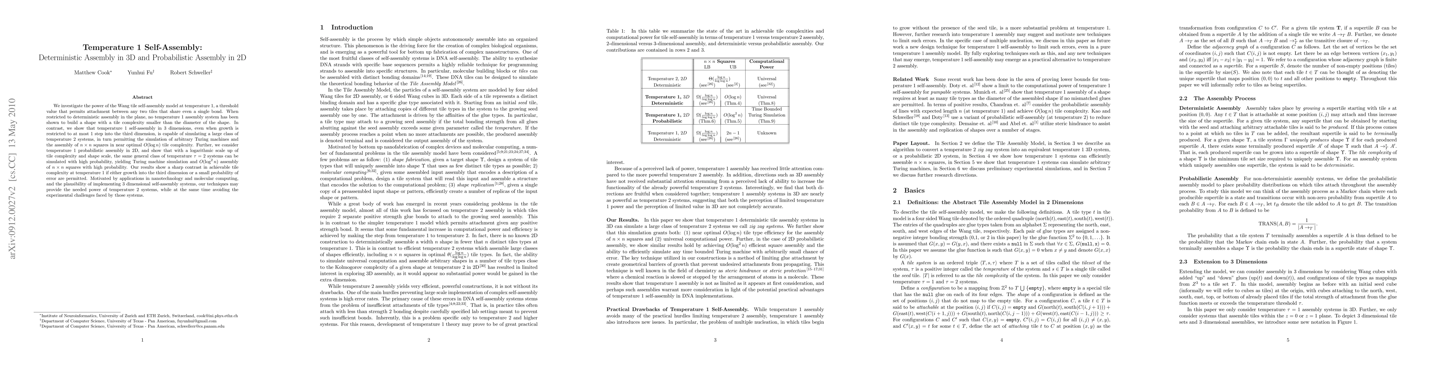This paper explores the Wang tile self-assembly model at temperature 1, demonstrating that 3D deterministic assembly can achieve near-optimal tile complexity for complex shapes, while 2D probabilistic assembly at the same temperature can simulate higher temperature systems with high probability. The findings highlight the significant difference in capabilities between 2D and 3D assembly at temperature 1.