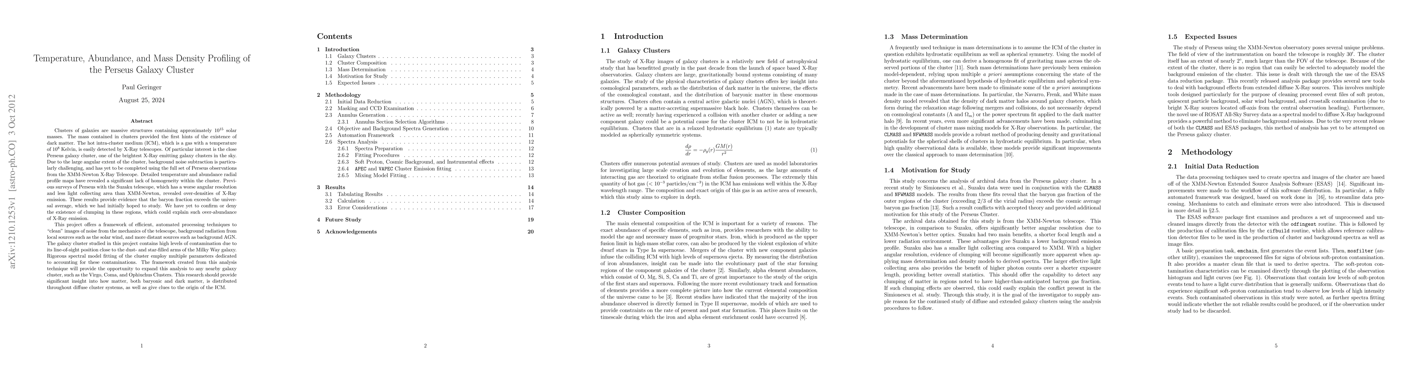 Detailed temperature and abundance radial profile maps have revealed a significant lack of homogeneity within the Perseus Galaxy cluster. Previous surveys of Perseus with the Suzaku telescope, which has a worse angular resolution and less light collecting area than XMM-Newton, revealed over-densities of X-Ray emission. These results provide evidence that the baryon fraction exceeds the universal average, which we had initially hoped to study. We have yet to confirm or deny the existence of clumping in these regions, which could explain such over-abundance of X-Ray emission. This project offers a framework of efficient, automated processing techniques to "clean" images of noise from the mechanics of the telescope, background radiation from local sources such as the solar wind, and more distant sources such as background AGN. The galaxy cluster studied in this project contains high levels of contamination due to its line-of-sight position close to the dust- and star-filled arms of the Milky Way galaxy. Rigorous spectral model fitting of the cluster employ multiple parameters dedicated to accounting for these contaminations. The framework created from this analysis technique will provide the opportunity to expand this analysis to any nearby galaxy cluster, such as the Virgo, Coma, and Ophiuchus Clusters. This research should provide significant insight into how matter, both baryonic and dark matter, is distributed throughout diffuse cluster systems, as well as give clues to the origin of the ICM.