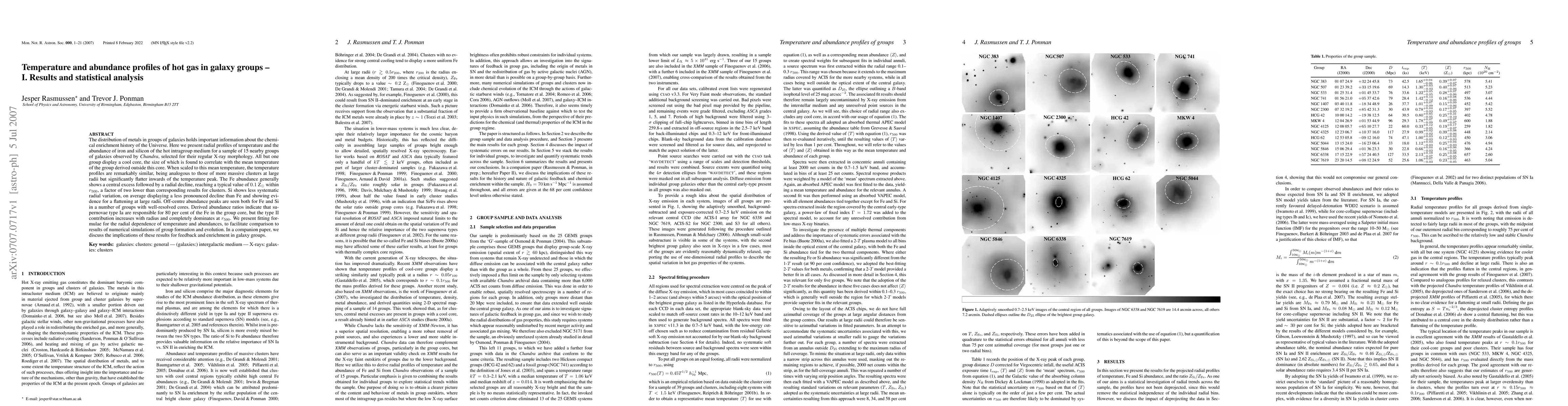 This study presents radial profiles of temperature and abundances of iron and silicon in the hot intragroup medium of 15 nearby galaxy groups, revealing similar temperature profiles to more massive clusters but flatter inwards. Iron abundance shows a central excess declining to 0.1 solar within r_500, while silicon abundance displays less systematic variation.