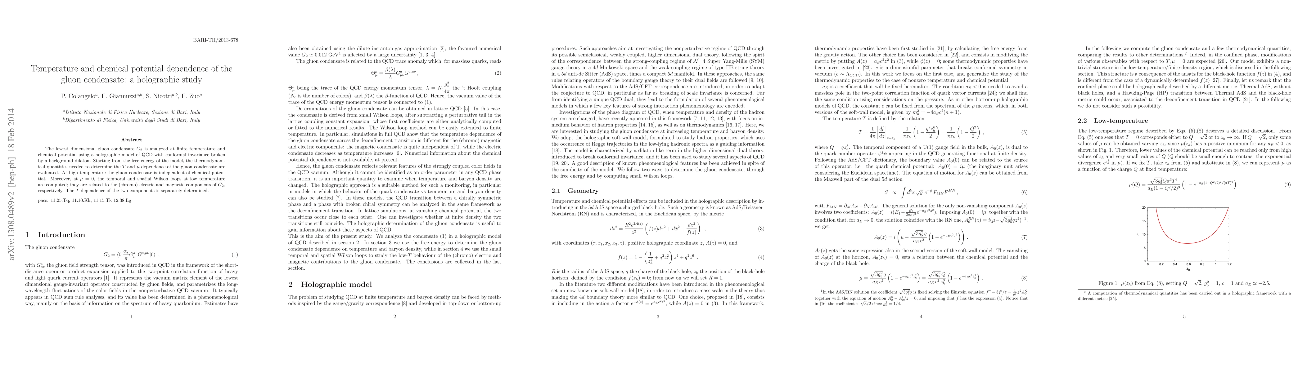 This research paper uses a holographic model to study the gluon condensate $G_2$ at finite temperature and chemical potential, revealing its independence from chemical potential at high temperatures. It also calculates the temporal and spatial Wilson loops at low temperatures and determines the $T$-dependence of the components of $G_2$.