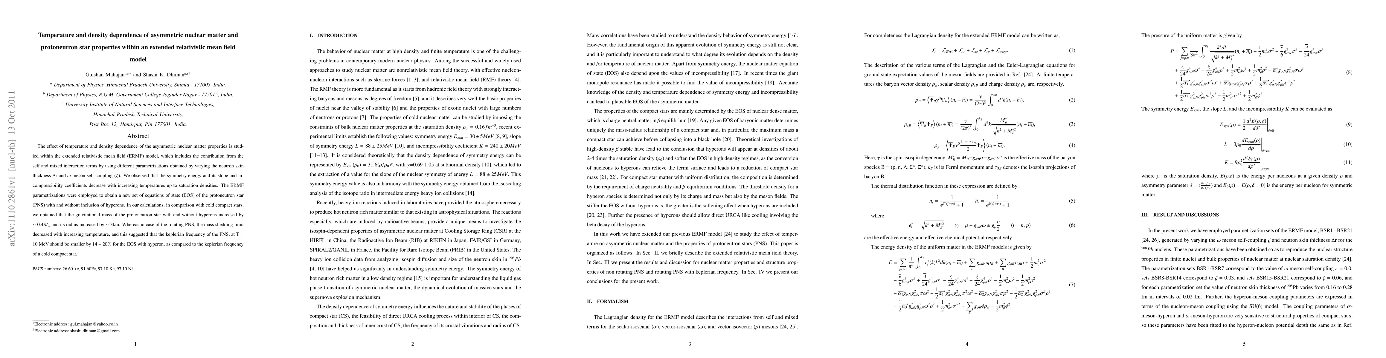 The effect of temperature and density dependence of the asymmetric nuclear matter properties is studied within the extended relativistic mean field (ERMF) model, which includes the contribution from the self and mixed interaction terms by using different parametrizations obtained by varying the neutron skin thickness $\Delta$r and $\omega$-meson self-coupling ($\zeta$). We observed that the symmetry energy and its slope and incompressibility coefficients decrease with increasing temperatures up to saturation densities. The ERMF parametrizations were employed to obtain a new set of equations of state (EOS) of the protoneutron star (PNS) with and without inclusion of hyperons. In our calculations, in comparison with cold compact stars, we obtained that the gravitational mass of the protoneutron star with and without hyperons increased by $\sim 0.4M_{\odot}$ and its radius increased by $\sim 3$km. Whereas in case of the rotating PNS, the mass shedding limit decreased with increasing temperature, and this suggested that the keplerian frequency of the PNS, at T = 10 MeV should be smaller by $14-20%$ for the EOS with hyperon, as compared to the keplerian frequency of a cold compact star.