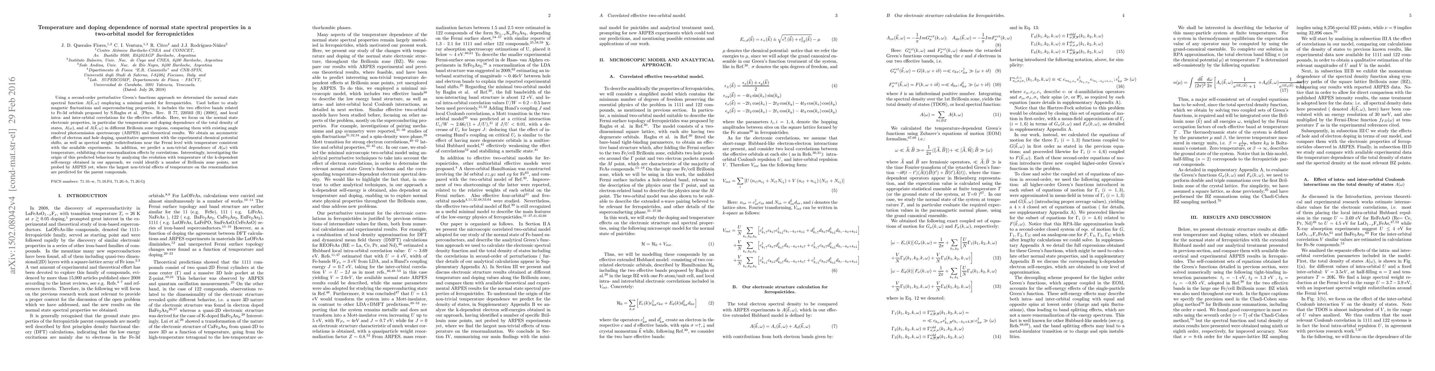 Using a second-order perturbative Green's functions approach we determined the normal state single-particle spectral function $A(\vec{k},\omega)$ employing a minimal effective model for iron-based superconductors. The microscopic model, used before to study magnetic fluctuations and superconducting properties, includes the two effective tight-binding bands proposed by S.Raghu et al. [Phys. Rev. B 77, 220503 (R) (2008)], and intra- and inter-orbital local electronic correlations, related to the Fe-3d orbitals. Here, we focus on the study of normal state electronic properties, in particular the temperature and doping dependence of the total density of states, $A(\omega)$, and of $A(\vec{k},\omega)$ in different Brillouin zone regions, and compare them to the existing angle resolved photoemission spectroscopy (ARPES) and previous theoretical results in ferropnictides. We obtain an asymmetric effect of electron and hole doping, quantitative agreement with the experimental chemical potential shifts as a function of doping, as well as spectral weight redistributions near the Fermi level as a function of temperature consistent with the available experimental data. In addition, we predict a non-trivial dependence of the total density of states with the temperature, exhibiting clear renormalization effects by correlations. Interestingly, investigating the origin of this predicted behaviour by analyzing the evolution with temperature of the k-dependent self-energy obtained in our approach, we could identify a number of specific Brillouin zone points, none of them probed by ARPES experiments yet, where the largest non-trivial effects of temperature on the renormalization are present.