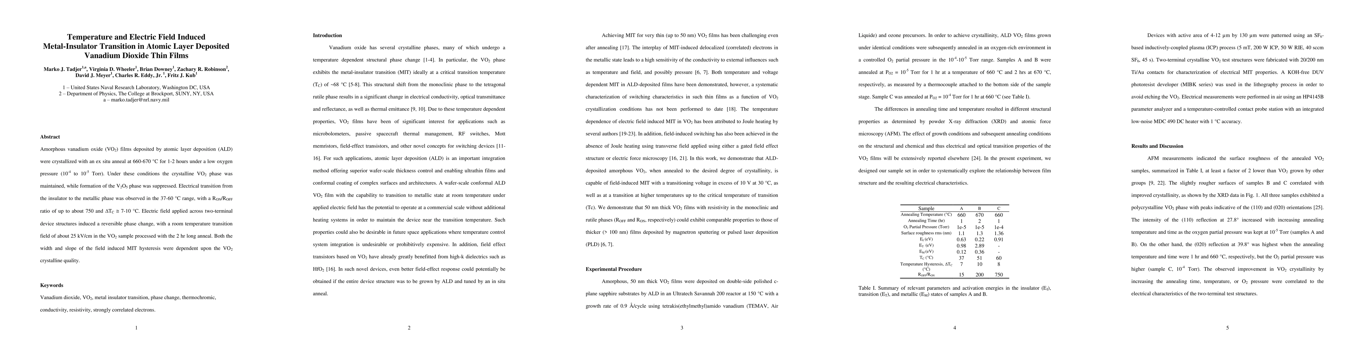 This paper investigates the metal-insulator transition in atomic layer deposited vanadium dioxide thin films, showing that temperature and electric fields can induce this transition, with a critical temperature range of 37-60 °C and a reversible phase change under an applied electric field of approximately 25 kV/cm. The transition's hysteresis width and slope are influenced by the film's crystalline quality.