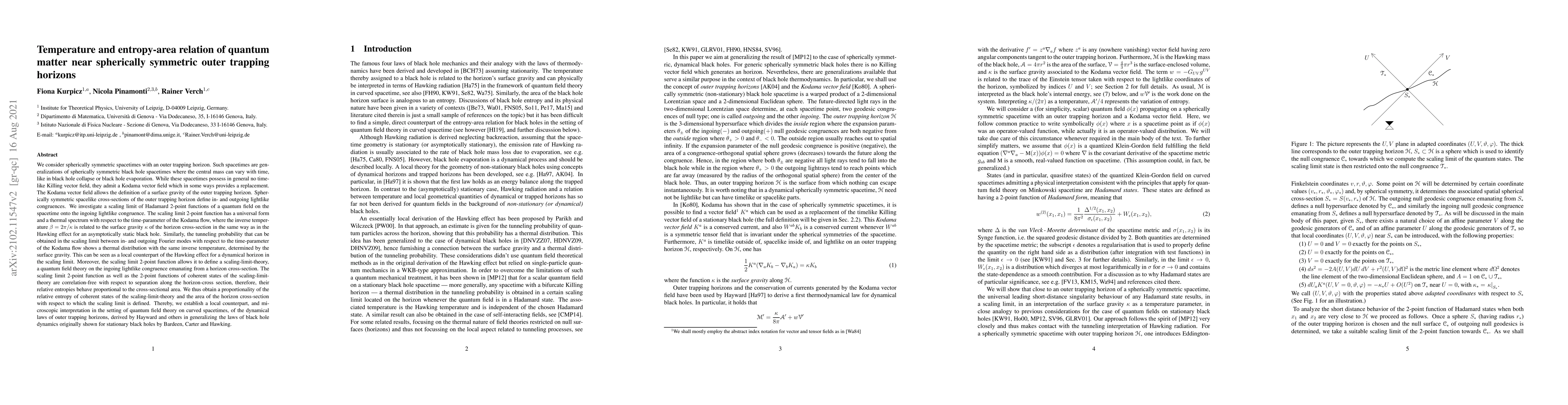 This paper investigates the temperature and entropy-area relation for quantum fields near spherically symmetric outer trapping horizons, revealing a thermal spectrum linked to the horizon's surface gravity akin to the Hawking effect. The entropy of scaling limit 2-point functions correlates proportionally with the horizon's cross-sectional area, establishing a local counterpart of dynamical black hole laws.