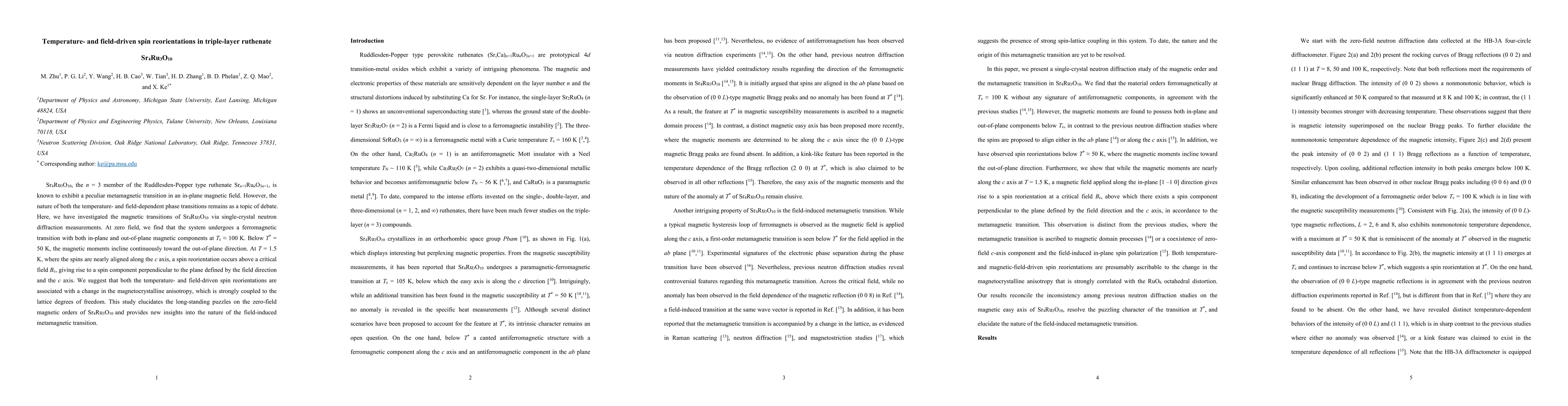 Researchers investigated Sr$_4$Ru$_3$O$_{10}$ via single-crystal neutron diffraction, revealing ferromagnetic transitions at 100K and spin reorientation above a critical field at 1.5K, driven by changes in magnetocrystalline anisotropy.