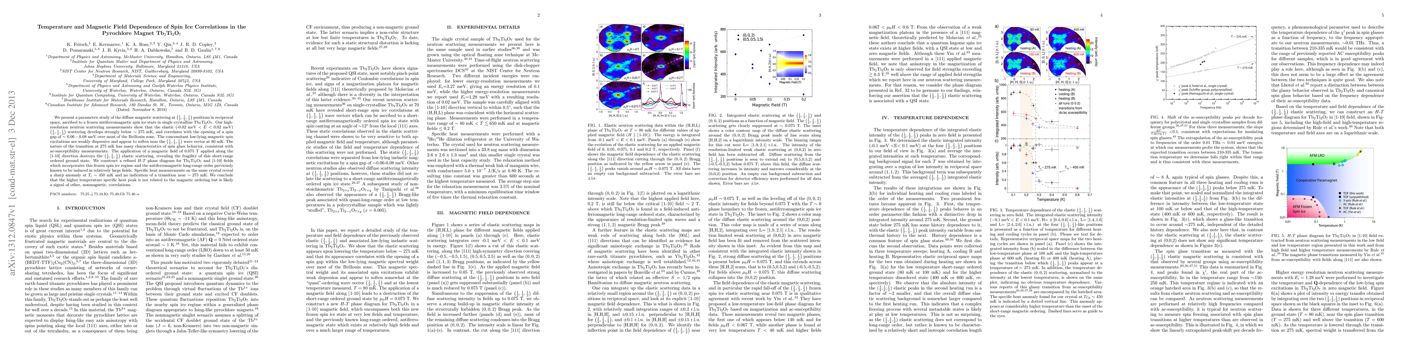 This study investigates the temperature and magnetic field dependence of spin ice correlations in Tb2Ti2O7 using neutron scattering, revealing a spin ice state developing below ~275 mK and a spin gap opening. A magnetic field along [1-10] disrupts the spin ice order, and specific heat measurements show no transition near 275 mK, suggesting the higher temperature peak is nonmagnetic.