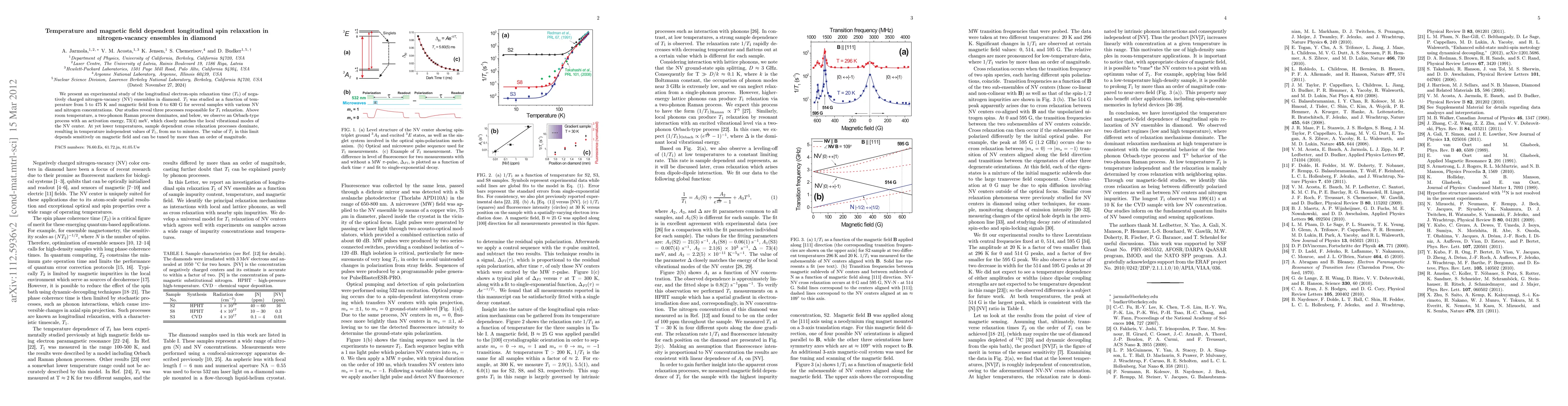 This study investigates the temperature and magnetic field dependence of longitudinal spin relaxation (T1) in nitrogen-vacancy ensembles in diamond, revealing three dominant relaxation processes: a two-phonon Raman process at higher temperatures, an Orbach-type process at lower temperatures, and sample-dependent cross relaxation at the lowest temperatures. T1 can be tuned by magnetic field, showing sensitivity over an order of magnitude.