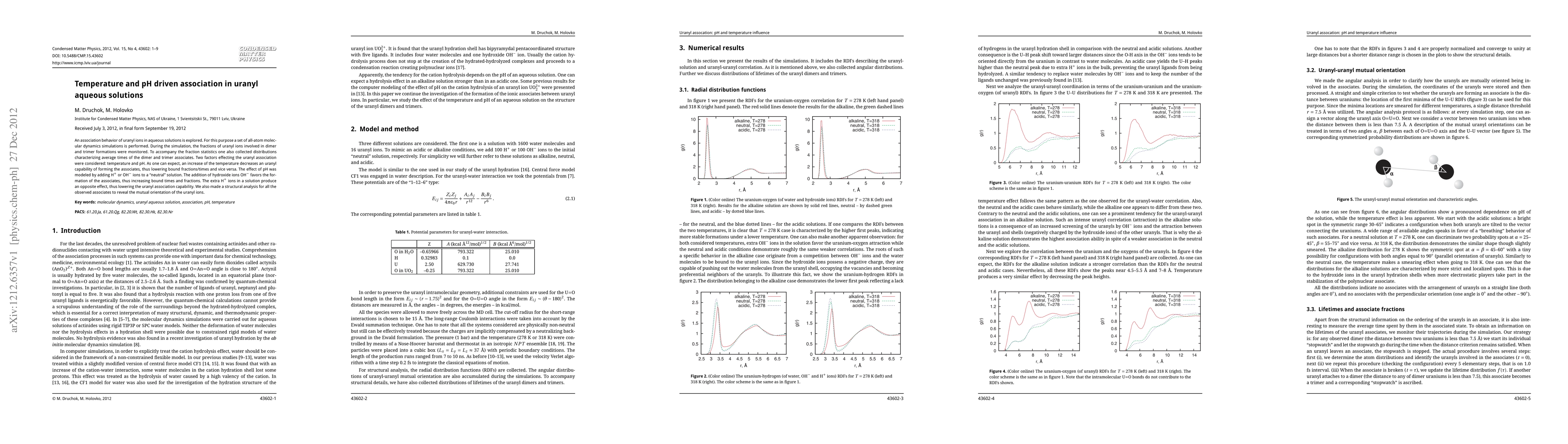 An association behavior of uranyl ions in aqueous solutions is explored. For this purpose a set of all-atom molecular dynamics simulations is performed. During the simulation, the fractions of uranyl ions involved in dimer and trimer formations were monitored. To accompany the fraction statistics one also collected distributions characterizing average times of the dimer and trimer associates. Two factors effecting the uranyl association were considered: temperature and pH. As one can expect, an increase of the temperature decreases an uranyl capability of forming the associates, thus lowering bound fractions/times and vice versa. The effect of pH was modeled by adding H^+ or OH^- ions to a "neutral" solution. The addition of hydroxide ions OH^- favors the formation of the associates, thus increasing bound times and fractions. The extra H^+ ions in a solution produce an opposite effect, thus lowering the uranyl association capability. We also made a structural analysis for all the observed associates to reveal the mutual orientation of the uranyl ions.