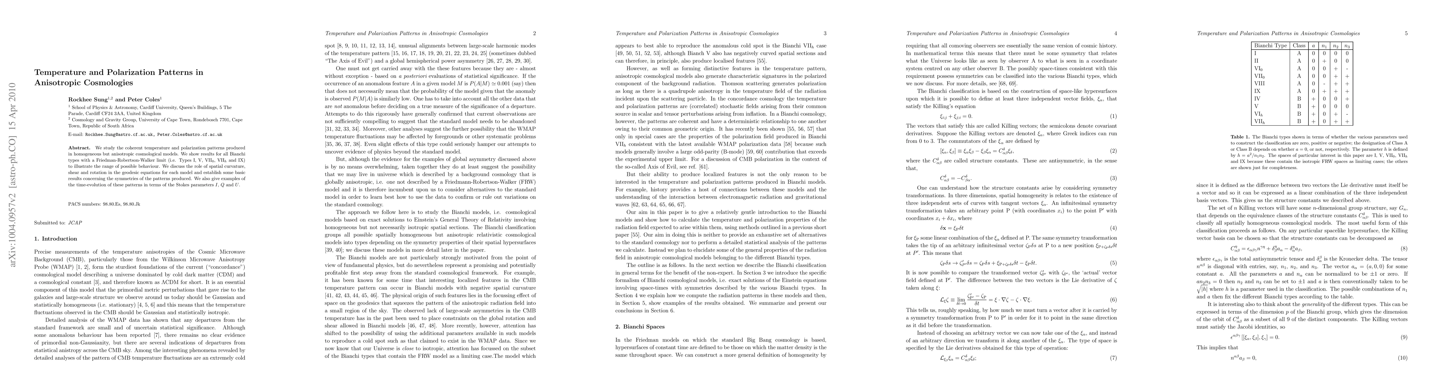 We study the coherent temperature and polarization patterns produced in homogeneous but anisotropic cosmological models. We show results for all Bianchi types with a Friedman-Robertson-Walker limit (i.e. Types I, V, VII$_{0}$, VII$_{h}$ and IX) to illustrate the range of possible behaviour. We discuss the role of spatial curvature, shear and rotation in the geodesic equations for each model and establish some basic results concerning the symmetries of the patterns produced. We also give examples of the time-evolution of these patterns in terms of the Stokes parameters $I$, $Q$ and $U$.