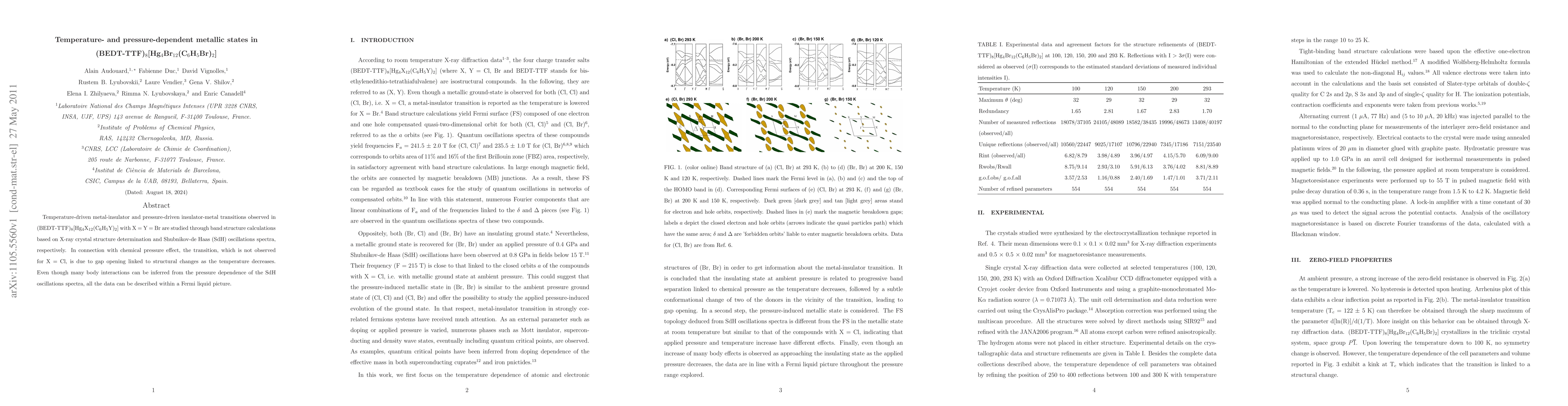 Temperature-driven metal-insulator and pressure-driven insulator-metal transitions observed in(BEDT-TTF)8[Hg4X12(C6H5Y)2]] with X = Y = Br are studied through band structure calculations based on X-ray crystal structure determination and Shubnikov-de Haas (SdH) oscillations spectra, respectively. In connection with chemical pressure effect, the transition, which is not observed for X = Cl, is due to gap opening linked to structural changes as the temperature decreases. Even though many body interactions can be inferred from the pressure dependence of the SdH oscillations spectra, all the data can be described within a Fermi liquid picture.