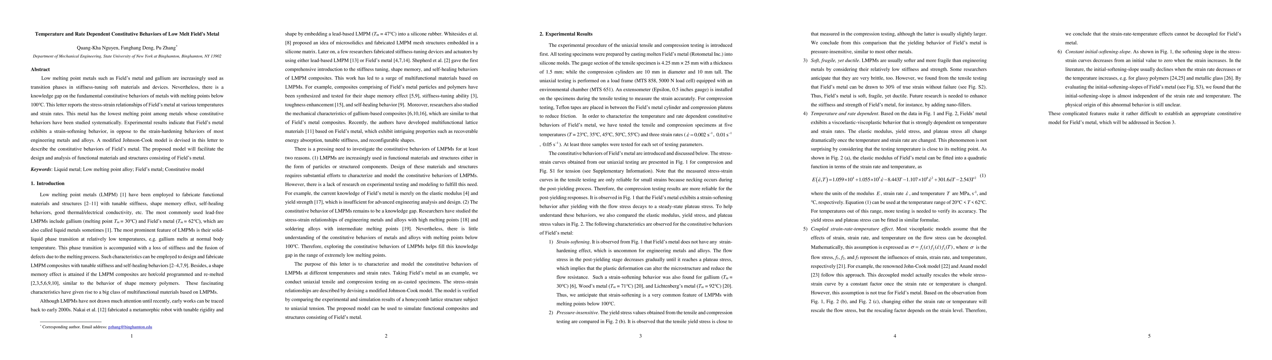 Low melting point metals such as Field's metal and gallium are increasingly used as transition phases in stiffness-tuning soft materials and devices. Nevertheless, there is a knowledge gap on the fundamental constitutive behaviors of metals with melting points below 100 degree. This letter reports the stress-strain relationships of Field's metal at various temperatures and strain rates. This metal has the lowest melting point among metals whose constitutive behaviors have been studied systematically. Experimental results indicate that Field's metal exhibits a strain-softening behavior, in oppose to the strain-hardening behaviors of most engineering metals and alloys. A modified Johnson-Cook model is devised in this letter to describe the constitutive behaviors of Field's metal. The proposed metal will facilitate the design and analysis of functional materials and structures consisting of Field's metal.