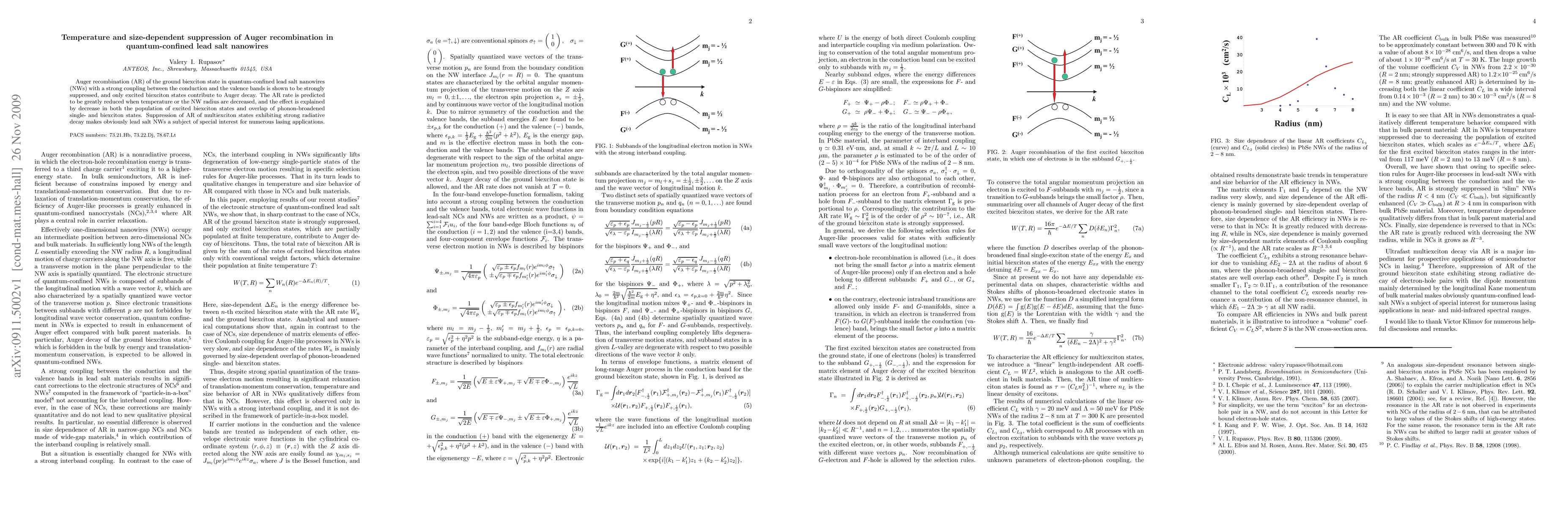 This study demonstrates that Auger recombination in quantum-confined lead salt nanowires is significantly suppressed, especially at lower temperatures and smaller radii, due to reduced population of excited biexciton states and decreased overlap of phonon-broadened states. The findings highlight lead salt nanowires as promising materials for lasing applications.