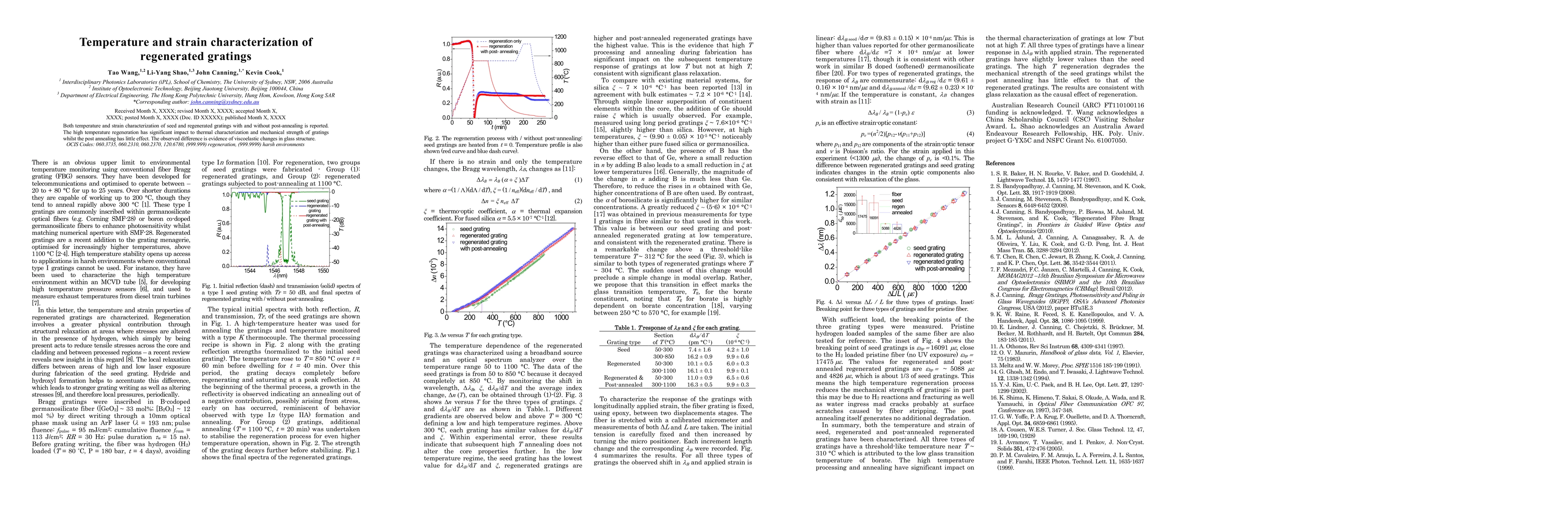 Both temperature and strain characterization of seed and regenerated gratings with and without post-annealing is reported. The high temperature regeneration has significant impact to thermal characterization and mechanical strength of gratings whilst the post annealing has little effect. The observed difference is evidence of viscoelastic changes in glass structure.