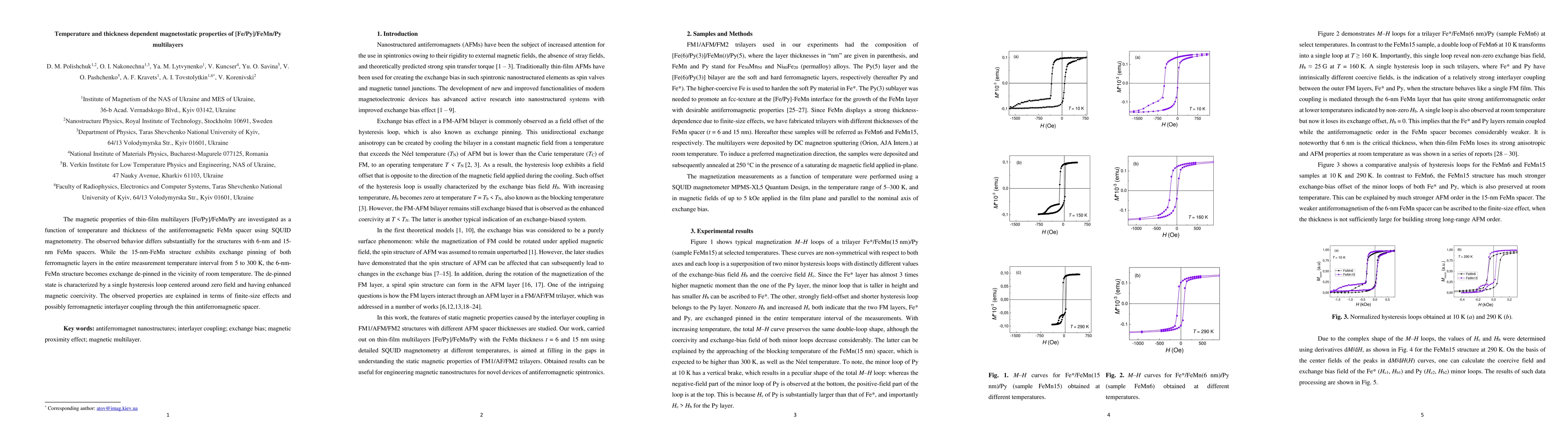 This paper investigates the temperature and thickness-dependent magnetostatic properties of [Fe/Py]/FeMn/Py multilayers using SQUID magnetometry. The 15-nm FeMn spacer maintains exchange pinning across all temperatures, while the 6-nm spacer exhibits exchange de-pinning near room temperature, showing enhanced coercivity and a single centered hysteresis loop, attributed to finite-size effects and interlayer coupling.