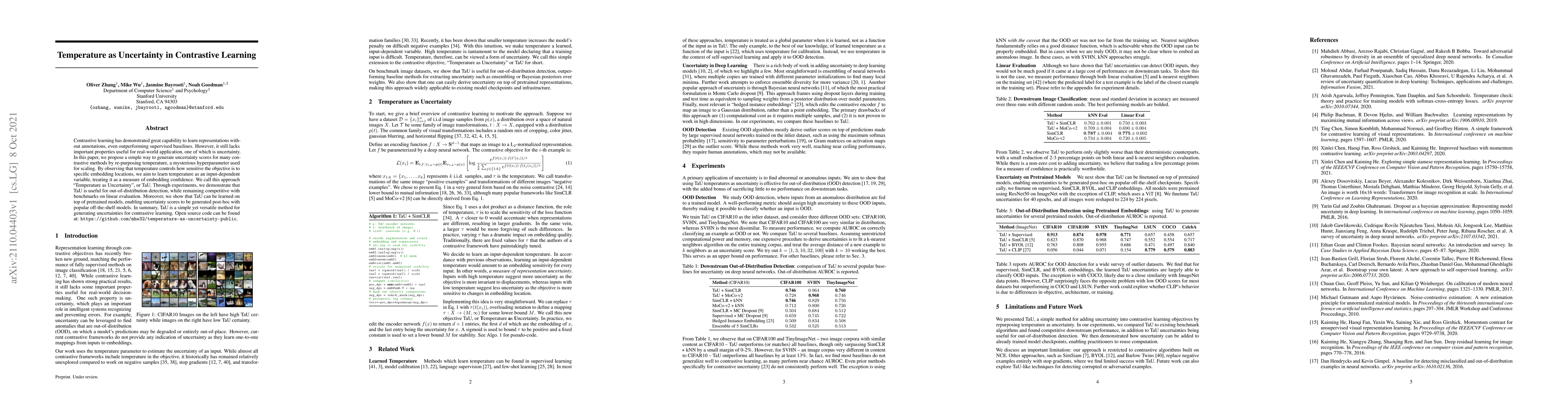 This paper proposes a method called "Temperature as Uncertainty" (TaU) to generate uncertainty scores for contrastive learning models by treating the temperature hyperparameter as a measure of embedding confidence. TaU enhances out-of-distribution detection and can be applied post-hoc to pretrained models, offering a simple yet effective way to incorporate uncertainty into contrastive learning.