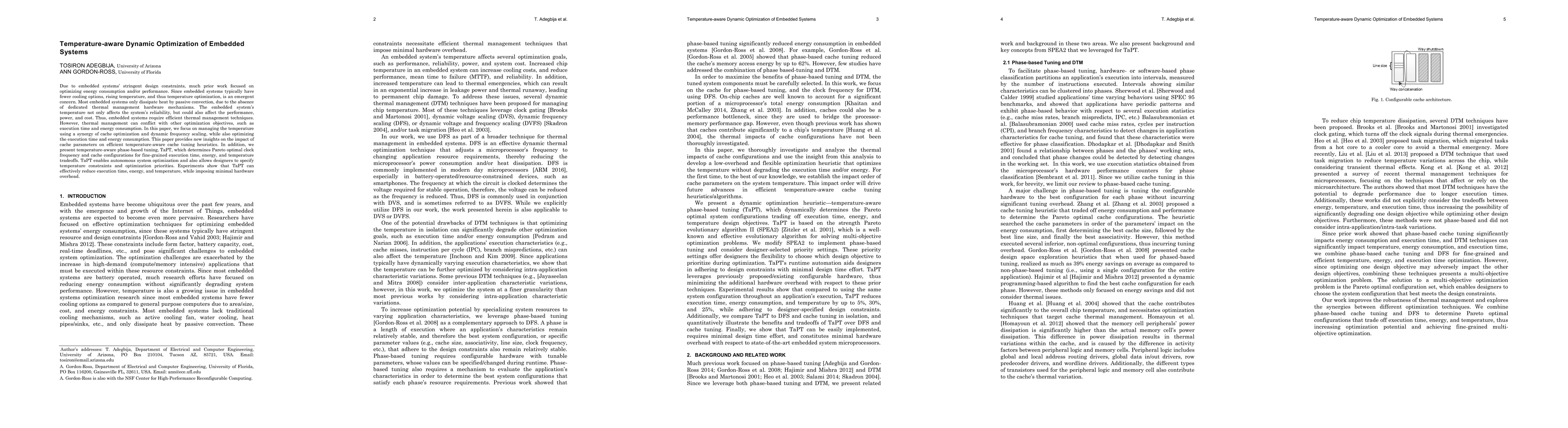 Due to embedded systems` stringent design constraints, much prior work focused on optimizing energy consumption and/or performance. Since embedded systems typically have fewer cooling options, rising temperature, and thus temperature optimization, is an emergent concern. Most embedded systems only dissipate heat by passive convection, due to the absence of dedicated thermal management hardware mechanisms. The embedded system`s temperature not only affects the system`s reliability, but could also affect the performance, power, and cost. Thus, embedded systems require efficient thermal management techniques. However, thermal management can conflict with other optimization objectives, such as execution time and energy consumption. In this paper, we focus on managing the temperature using a synergy of cache optimization and dynamic frequency scaling, while also optimizing the execution time and energy consumption. This paper provides new insights on the impact of cache parameters on efficient temperature-aware cache tuning heuristics. In addition, we present temperature-aware phase-based tuning, TaPT, which determines Pareto optimal clock frequency and cache configurations for fine-grained execution time, energy, and temperature tradeoffs. TaPT enables autonomous system optimization and also allows designers to specify temperature constraints and optimization priorities. Experiments show that TaPT can effectively reduce execution time, energy, and temperature, while imposing minimal hardware overhead.