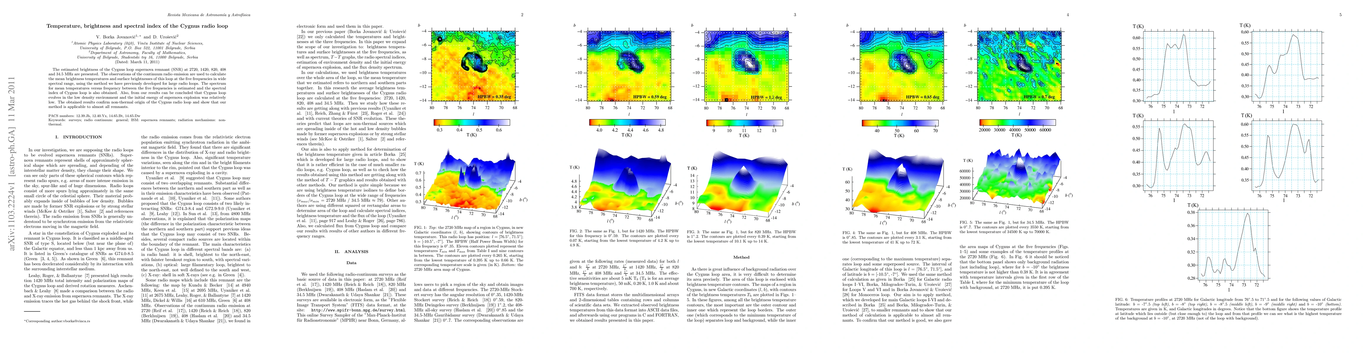 This paper presents the brightness and spectral index of the Cygnus radio loop across multiple frequencies, confirming its non-thermal origin and suggesting a low-density environment and relatively low initial energy for the supernova explosion. The study employs a developed method for large radio loops to analyze the continuum radio emission.