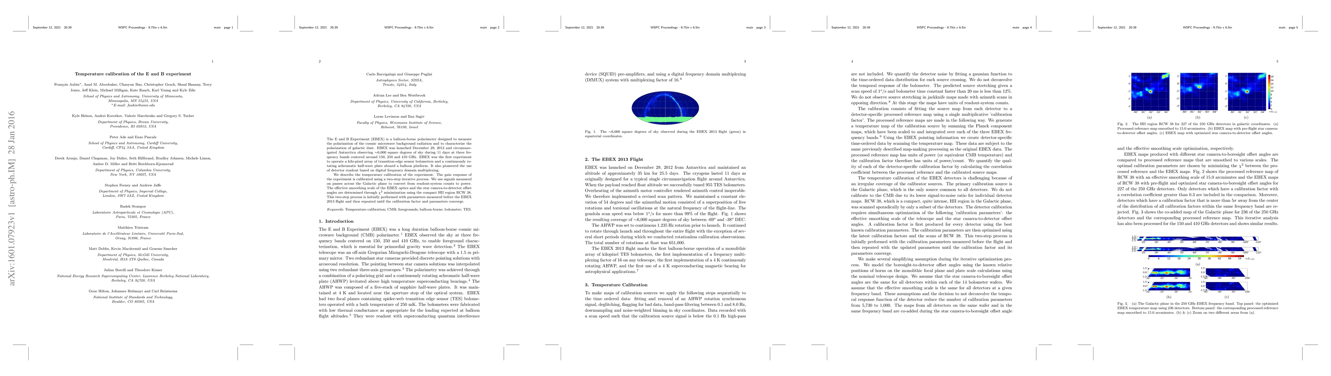 The E and B Experiment (EBEX) is a balloon-borne polarimeter designed to measure the polarization of the cosmic microwave background radiation and to characterize the polarization of galactic dust. EBEX was launched December 29, 2012 and circumnavigated Antarctica observing $\sim$6,000 square degrees of sky during 11 days at three frequency bands centered around 150, 250 and 410 GHz. EBEX was the first experiment to operate a kilo-pixel array of transition-edge sensor bolometers and a continuously rotating achromatic half-wave plate aboard a balloon platform. It also pioneered the use of detector readout based on digital frequency domain multiplexing. We describe the temperature calibration of the experiment. The gain response of the experiment is calibrated using a two-step iterative process. We use signals measured on passes across the Galactic plane to convert from readout-system counts to power. The effective smoothing scale of the EBEX optics and the star camera-to-detector offset angles are determined through \c{hi}2 minimization using the compact HII region RCW 38. This two-step process is initially performed with parameters measured before the EBEX 2013 flight and then repeated until the calibration factor and parameters converge.