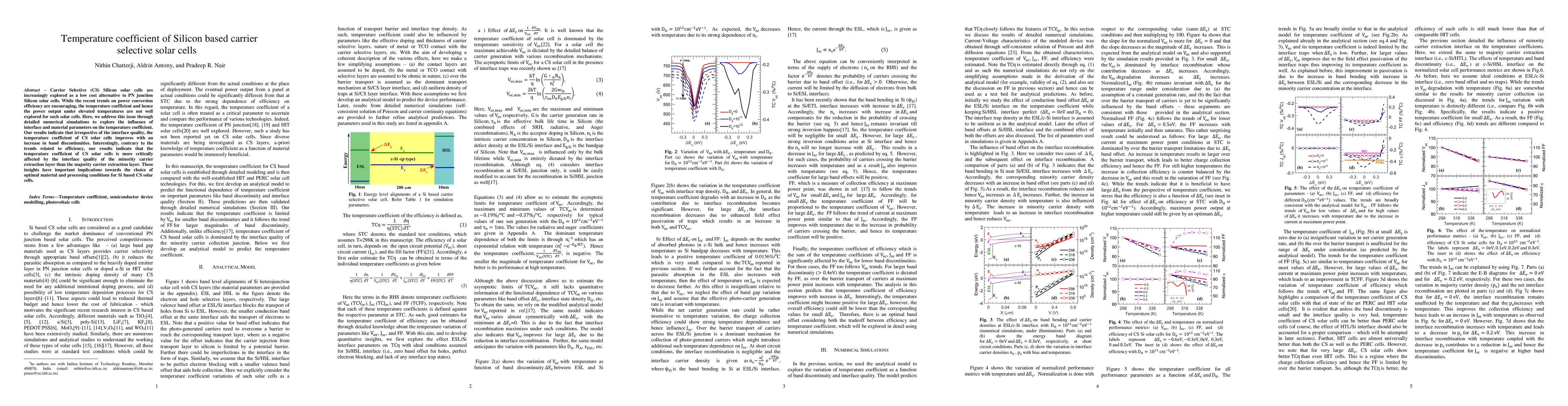 This study investigates the temperature coefficient of carrier selective silicon solar cells through numerical simulations. It finds that while band discontinuities improve the temperature coefficient, the interface quality of the minority carrier extraction layer has a more significant impact than that of the majority carrier extraction layer.