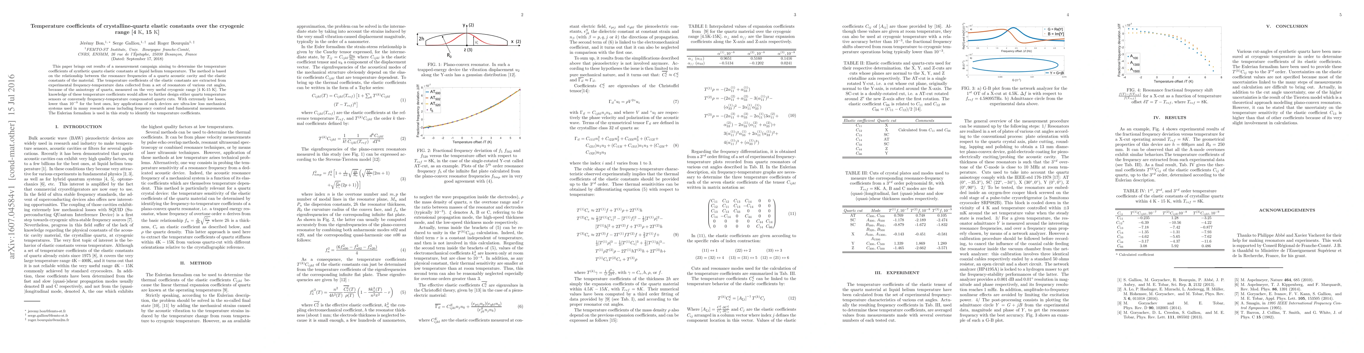 This paper brings out results of a measurement campaign aiming to determine the temperature coefficients of synthetic quartz elastic constants at liquid helium temperature. The method is based on the relationship between the resonance frequencies of a quartz acoustic cavity and the elastic constants of the material. The temperature coefficients of the elastic constants are extracted from experimental frequency-temperature data collected from a set of resonators of various cut angles, because of the anisotropy of quartz, measured on the very useful cryogenic range [4 K - 15 K]. The knowledge of these temperature coefficients would allow to further design either quartz temperature sensors or conversely frequency-temperature compensated quartz cuts. With extremely low losses, lower than $10^{-9}$ for the best ones, key applications of such devices are ultra-low loss mechanical systems used in many research areas including frequency control and fundamental measurements. The Eulerian formalism is used in this study to identify the temperature coefficients.