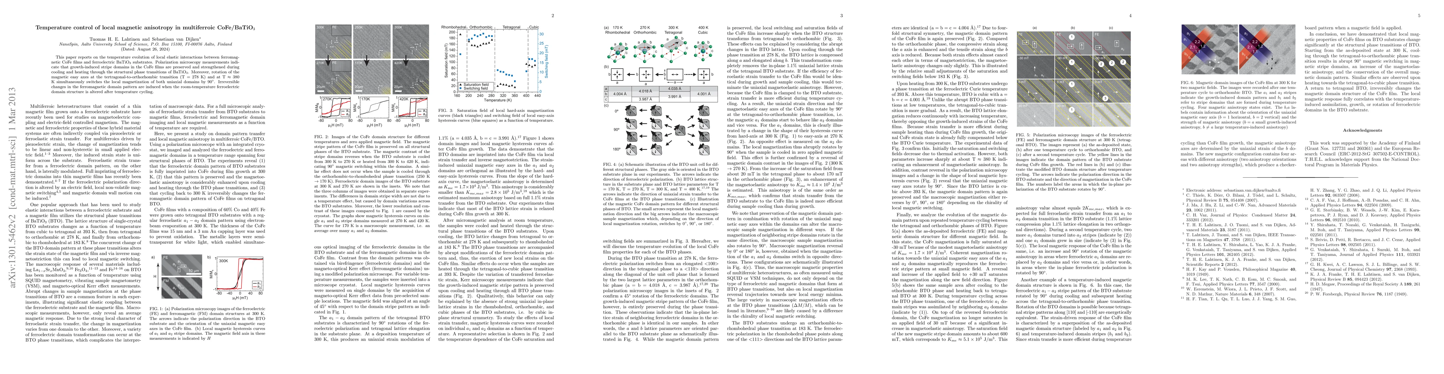 This paper reports on the temperature evolution of local elastic interactions between ferromagnetic CoFe films and ferroelectric BaTiO3 substrates. Polarization microscopy measurements indicate that growth-induced stripe domains in the CoFe films are preserved and strengthened during cooling and heating through the structural phase transitions of BaTiO3. Moreover, rotation of the magnetic easy axes at the tertragonal-to-orthorhombic transition (T = 278 K) and at T = 380 K simultaneously switches the local magnetization of both uniaxial domains by 90 degrees. Irreversible changes in the ferromagnetic domain pattern are induced when the room-temperature ferroelectric domain structure is altered after temperature cycling.
