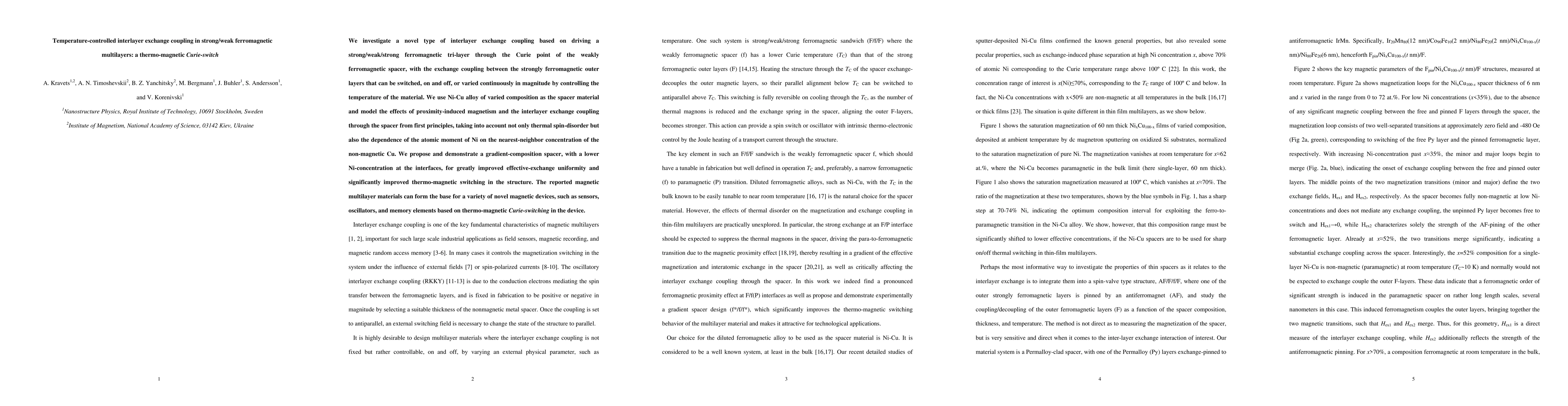 We investigate a novel type of interlayer exchange coupling based on driving a strong/weak/strong ferromagnetic tri-layer through the Curie point of the weakly ferromagnetic spacer, with the exchange coupling between the strongly ferromagnetic outer layers that can be switched, on and off, or varied continuously in magnitude by controlling the temperature of the material. We use Ni-Cu alloy of varied composition as the spacer material and model the effects of proximity-induced magnetism and the interlayer exchange coupling through the spacer from first principles, taking into account not only thermal spin-disorder but also the dependence of the atomic moment of Ni on the nearest-neighbor concentration of the non-magnetic Cu. We propose and demonstrate a gradient-composition spacer, with a lower Ni-concentration at the interfaces, for greatly improved effective-exchange uniformity and significantly improved thermo-magnetic switching in the structure. The reported magnetic multilayer materials can form the base for a variety of novel magnetic devices, such as sensors, oscillators, and memory elements based on thermo-magnetic Curie-switching in the device.