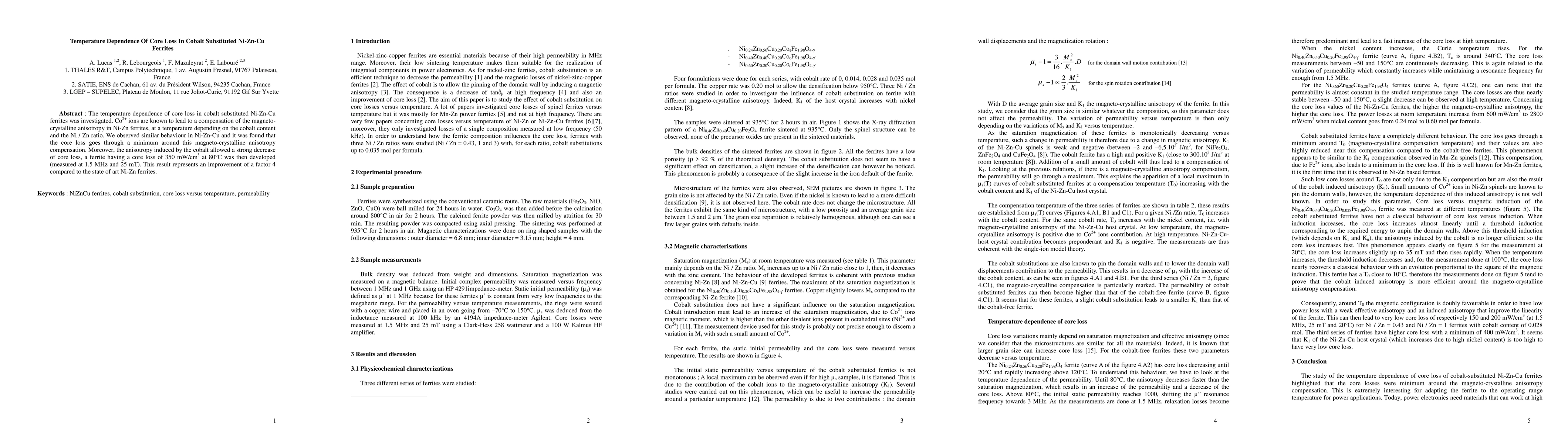 This study investigates how core loss in cobalt-substituted Ni-Zn-Cu ferrites varies with temperature, finding that the core loss reaches a minimum at the temperature where magneto-crystalline anisotropy is compensated. The research developed a ferrite with significantly reduced core loss, improving upon existing Ni-Zn ferrites by a factor of 4.