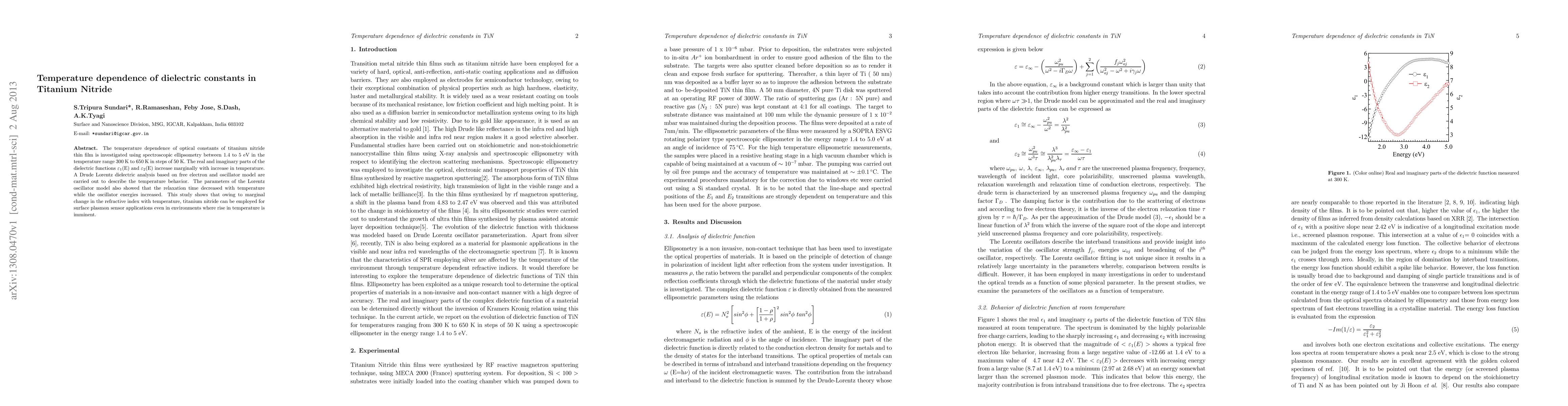 The temperature dependence of optical constants of titanium nitride thin film is investigated using spectroscopic ellipsometry between 1.4 to 5 eV in the temperature range 300 K to 650 K in steps of 50 K. The real and imaginary parts of the dielectric functions "1(E) and "2(E) increase marginally with increase in temperature. A Drude Lorentz dielectric analysis based on free electron and oscillator model are carried out to describe the temperature behavior. The parameters of the Lorentz oscillator model also showed that the relaxation time decreased with temperature while the oscillator energies increased. This study shows that owing to marginal change in the refractive index with temperature, titanium nitride can be employed for surface plasmon sensor applications even in environments where rise in temperature is imminent.
