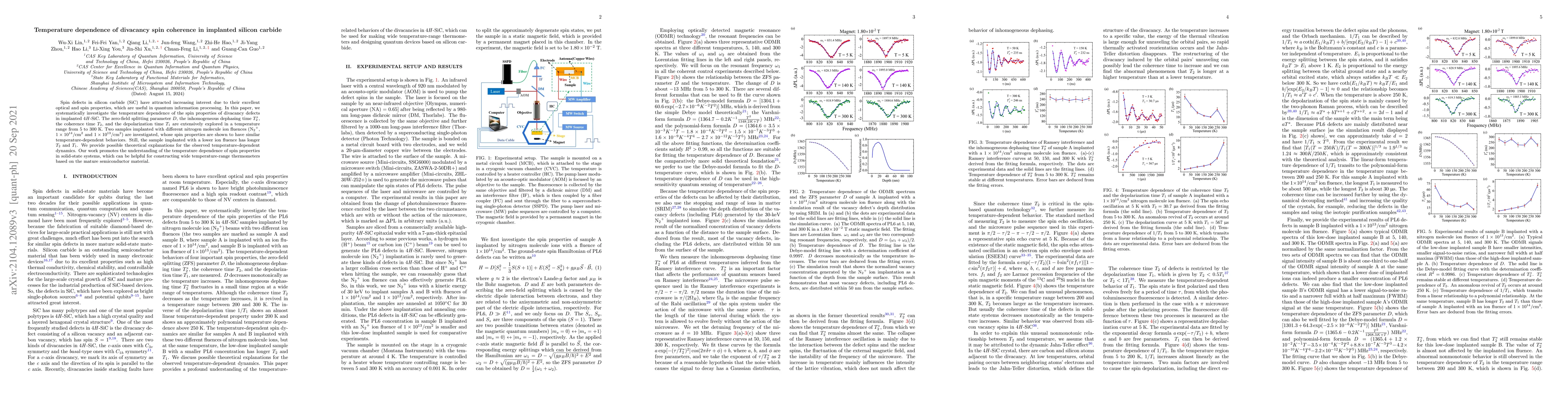This paper investigates the temperature dependence of spin coherence in divacancy defects in implanted 4H-SiC, finding that the coherence time $T_2$ and relaxation time $T_1$ vary with temperature from 5 to 300 K. Samples with different nitrogen ion fluences show similar temperature-dependent behaviors but differing coherence times.
