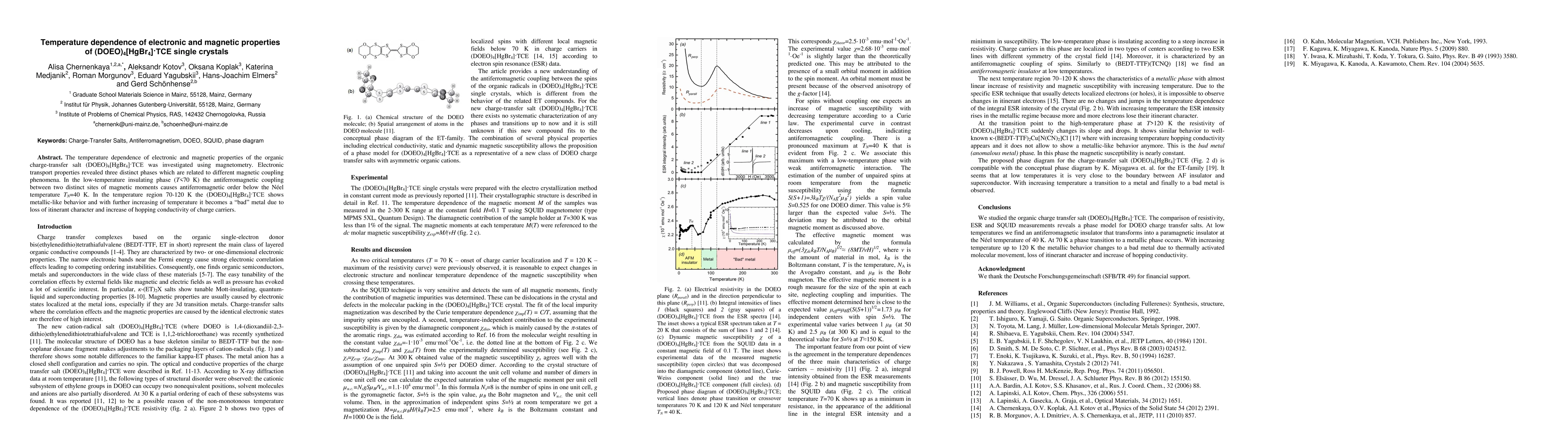 The temperature dependence of electronic and magnetic properties of the organic charge-transfer salt (DOEO)$_4$[HgBr$_4$]TCE was investigated using magnetometry. Electronic transport properties revealed three distinct phases which are related to different magnetic coupling phenomena. In the low-temperature insulating phase (T<70 K) the antiferromagnetic coupling between two distinct sites of magnetic moments causes antiferromagnetic order below the N\'eel temperature T$_N$=40 K. In the temperature region 70-120 K the (DOEO)$_4$[HgBr$_4$]TCE shows metallic-like behavior and with further increasing of temperature it becomes a bad metal due to loss of itinerant character and increase of hopping conductivity of charge carriers.