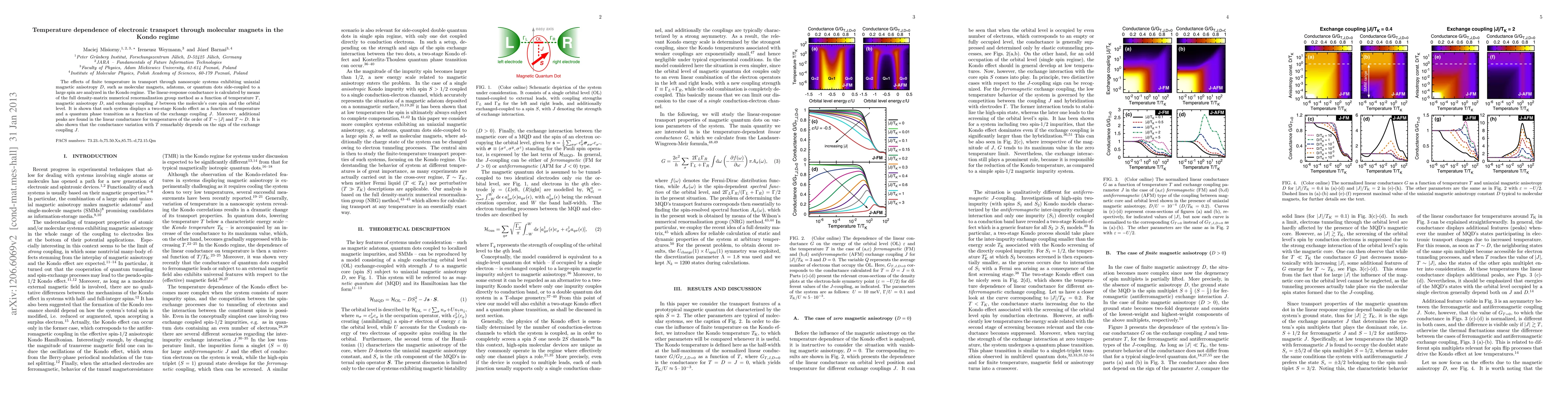 Researchers studied how temperature affects electronic transport in molecular magnets, finding a two-stage Kondo effect and quantum phase transition depending on exchange coupling strength.