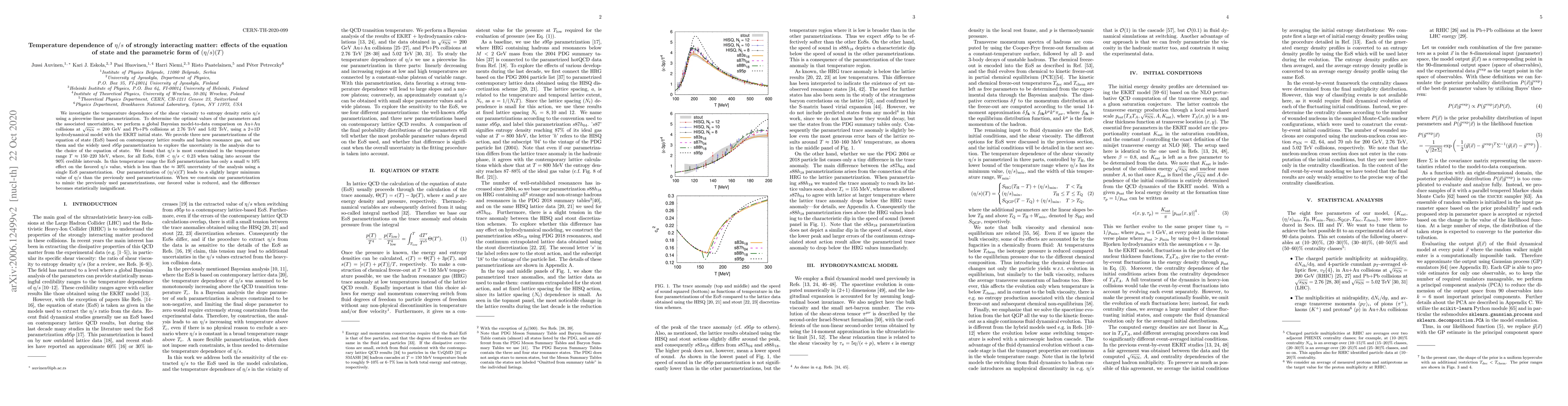 We investigate the temperature dependence of the shear viscosity to entropy density ratio $\eta/s$ using a piecewise linear parametrization. To determine the optimal values of the parameters and the associated uncertainties, we perform a global Bayesian model-to-data comparison on Au+Au collisions at $\sqrt{s_{NN}}=200$ GeV and Pb+Pb collisions at $2.76$ TeV and $5.02$ TeV, using a 2+1D hydrodynamical model with the EKRT initial state. We provide three new parametrizations of the equation of state (EoS) based on contemporary lattice results and hadron resonance gas, and use them and the widely used $s95p$ parametrization to explore the uncertainty in the analysis due to the choice of the equation of state. We found that $\eta/s$ is most constrained in the temperature range $T\approx 150$--$220$ MeV, where, for all EoSs, $0.08 < \eta/s < 0.23$ when taking into account the 90% credible intervals. In this temperature range the EoS parametrization has only a small $\approx 10\%$ effect on the favored $\eta/s$ value, which is less than the $\approx 30\%$ uncertainty of the analysis using a single EoS parametrization. Our parametrization of $(\eta/s)(T)$ leads to a slightly larger minimum value of $\eta/s$ than the previously used parametrizations. When we constrain our parametrization to mimic the previously used parametrizations, our favored value is reduced, and the difference becomes statistically insignificant.
