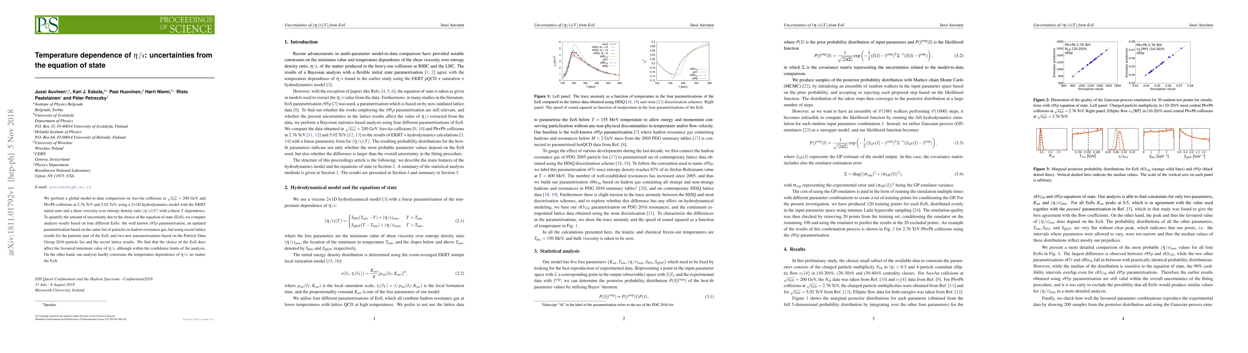 We perform a global model-to-data comparison on Au+Au collisions at $\sqrt{s_{NN}}=200$ GeV and Pb+Pb collisions at $2.76$ TeV and $5.02$ TeV, using a 2+1D hydrodynamics model with the EKRT initial state and a shear viscosity over entropy density ratio $(\eta/s)(T)$ with a linear $T$ dependence. To quantify the amount of uncertainty due to the choice of the equation of state (EoS), we compare analysis results based on four different EoSs: the well known $s95p$ parametrisation, an updated parametrisation based on the same list of particles in hadron resonance gas, but using recent lattice results for the partonic part of the EoS, and two new parametrisations based on the Particle Data Group 2016 particle list and the recent lattice results. We find that the choice of the EoS does affect the favoured minimum value of $\eta/s$, although within the confidence limits of the analysis. On the other hand, our analysis hardly constrains the temperature dependence of $\eta/s$, no matter the EoS.