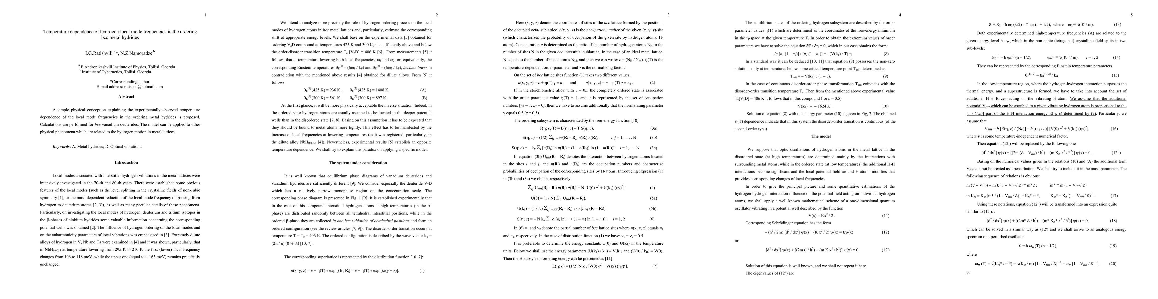 A simple physical conception explaining the experimentally observed temperature dependence of the local mode frequencies in the ordering metal hydrides is proposed. Calculations are performed for bcc vanadium deuterides. The model can be applied to other physical phenomena which are related to the hydrogen motion in metal lattices.