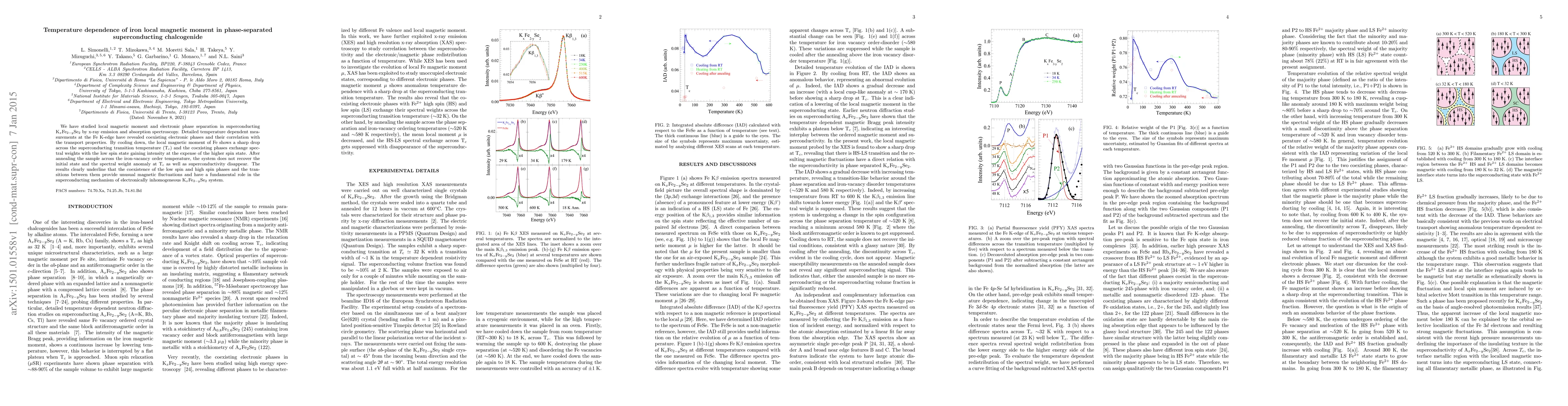 We have studied local magnetic moment and electronic phase separation in superconducting K$_{x}$Fe$_{2-y}$Se$_2$ by x-ray emission and absorption spectroscopy. Detailed temperature dependent measurements at the Fe K-edge have revealed coexisting electronic phases and their correlation with the transport properties. By cooling down, the local magnetic moment of Fe shows a sharp drop across the superconducting transition temperature (T$_c$) and the coexisting phases exchange spectral weights with the low spin state gaining intensity at the expense of the higher spin state. After annealing the sample across the iron-vacancy order temperature, the system does not recover the initial state and the spectral weight anomaly at T$_c$ as well as superconductivity disappear. The results clearly underline that the coexistence of the low spin and high spin phases and the transitions between them provide unusual magnetic fluctuations and have a fundamental role in the superconducting mechanism of electronically inhomogeneous K$_{x}$Fe$_{2-y}$Se$_2$ system.