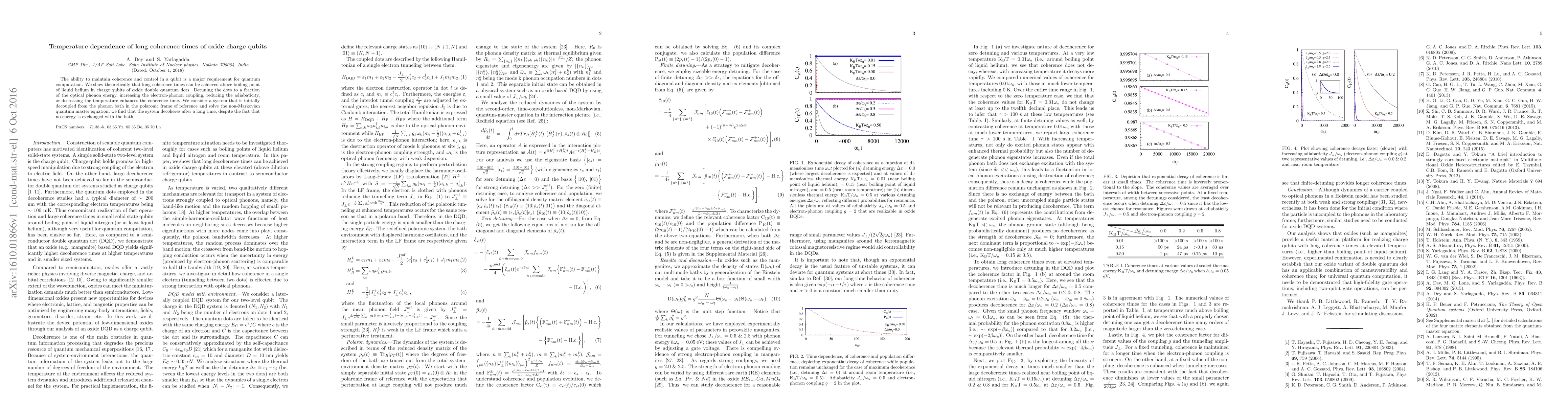 This paper theoretically demonstrates that long coherence times in oxide charge qubits of double quantum dots can be achieved even above the boiling point of liquid helium by manipulating parameters like electron-phonon coupling and temperature. The study finds that coherence is maintained despite decoupling from the phonon bath, solved via the non-Markovian quantum master equation.