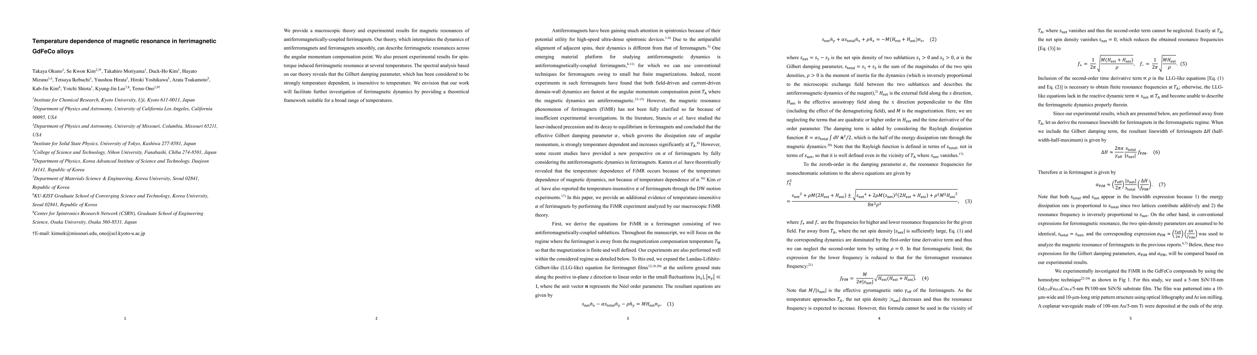 This paper presents a macroscopic theory for ferrimagnetic resonances in GdFeCo alloys, successfully describing dynamics across angular momentum compensation. Experimental results show that the Gilbert damping parameter is temperature-insensitive, contrary to prior beliefs, thus providing a theoretical framework for studying ferrimagnetic dynamics over a broad temperature range.