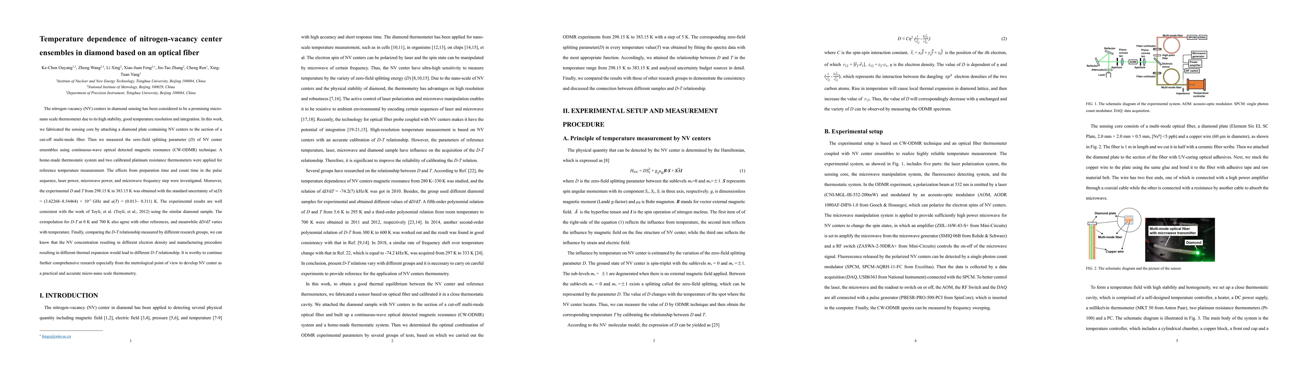 The nitrogen-vacancy (NV) centers in diamond sensing has been considered to be a promising micro-nano scale thermometer due to its high stability, good temperature resolution and integration. In this work, we fabricated the sensing core by attaching a diamond plate containing NV centers to the section of a cut-off multi-mode fiber. Then we measured the zero-field splitting parameter (D) of NV center ensembles using continuous-wave optical detected magnetic resonance (CW-ODMR) technique. A home-made thermostatic system and two calibrated platinum resistance thermometers were applied for reference temperature measurement. The effects from preparation time and count time in the pulse sequence, laser power, microwave power, and microwave frequency step were investigated. Moreover, the experimental D and T from 298.15 K to 383.15 K was obtained with the standard uncertainty of u(D) = (3.62268~8.54464)x10^-5 GHz and u(T) = (0.013~ 0.311) K. The experimental results are well consistent with the work of Toyli, et al. (Toyli, et al., 2012) using the similar diamond sample. The extrapolation for D-T at 0 K and 700 K also agree with other references, and meanwhile dD/dT varies with temperature. Finally, comparing the D-T relationship measured by different research groups, we can know that the NV concentration resulting in different electron density and manufacturing procedure resulting in different thermal expansion would lead to different D-T relationship. It is worthy to continue further comprehensive research especially from the metrological point of view to develop NV center as a practical and accurate micro-nano scale thermometry.