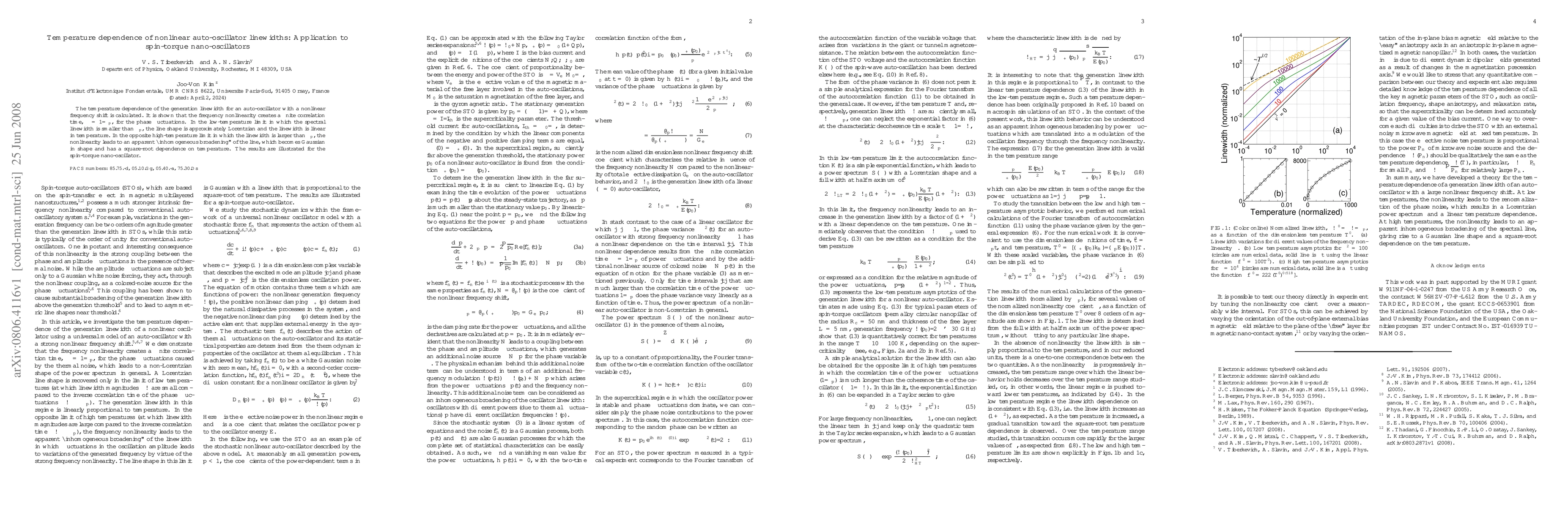 This paper investigates the temperature dependence of nonlinear auto-oscillator linewidths, demonstrating that frequency nonlinearity induces a finite correlation time for phase fluctuations. The linewidth exhibits linear dependence on temperature in low-temperature regimes and a square-root dependence in high-temperature regimes, illustrated through spin-torque nano-oscillators.