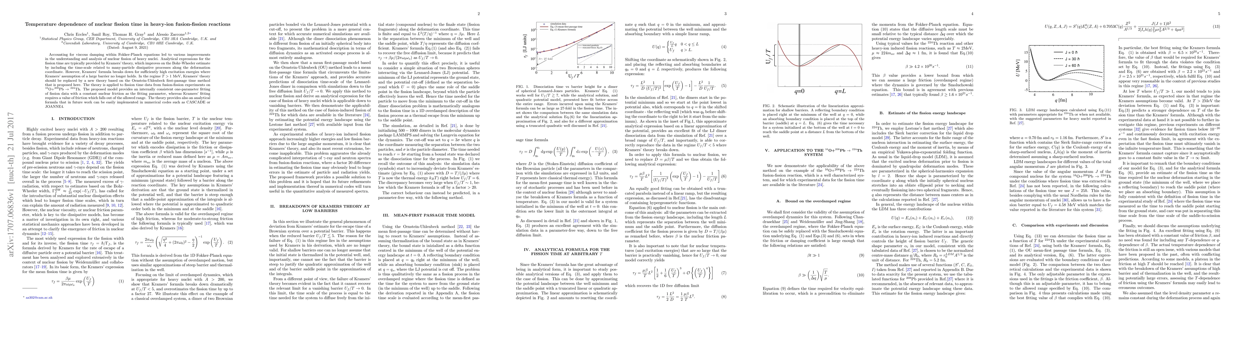 Accounting for viscous damping within Fokker-Planck equations led to various improvements in the understanding and analysis of nuclear fission of heavy nuclei. Analytical expressions for the fission time are typically provided by Kramers' theory, which improves on the Bohr-Wheeler estimate by including the time-scale related to many-particle dissipative processes along the deformation coordinate. However, Kramers' formula breaks down for sufficiently high excitation energies where Kramers' assumption of a large barrier no longer holds. In the regime $T>1$ MeV, Kramers' theory should be replaced by a new theory based on the Ornstein-Uhlenbeck first-passage time method that is proposed here. The theory is applied to fission time data from fusion-fission experiments on $^{16}$O+$^{208}$Pb $\rightarrow$ $^{224}$Th. The proposed model provides an internally consistent one-parameter fitting of fission data with a constant nuclear friction as the fitting parameter, whereas Kramers' fitting requires a value of friction which falls out of the allowed range. The theory provides also an analytical formula that in future work can be easily implemented in numerical codes such as CASCADE or JOANNE4.